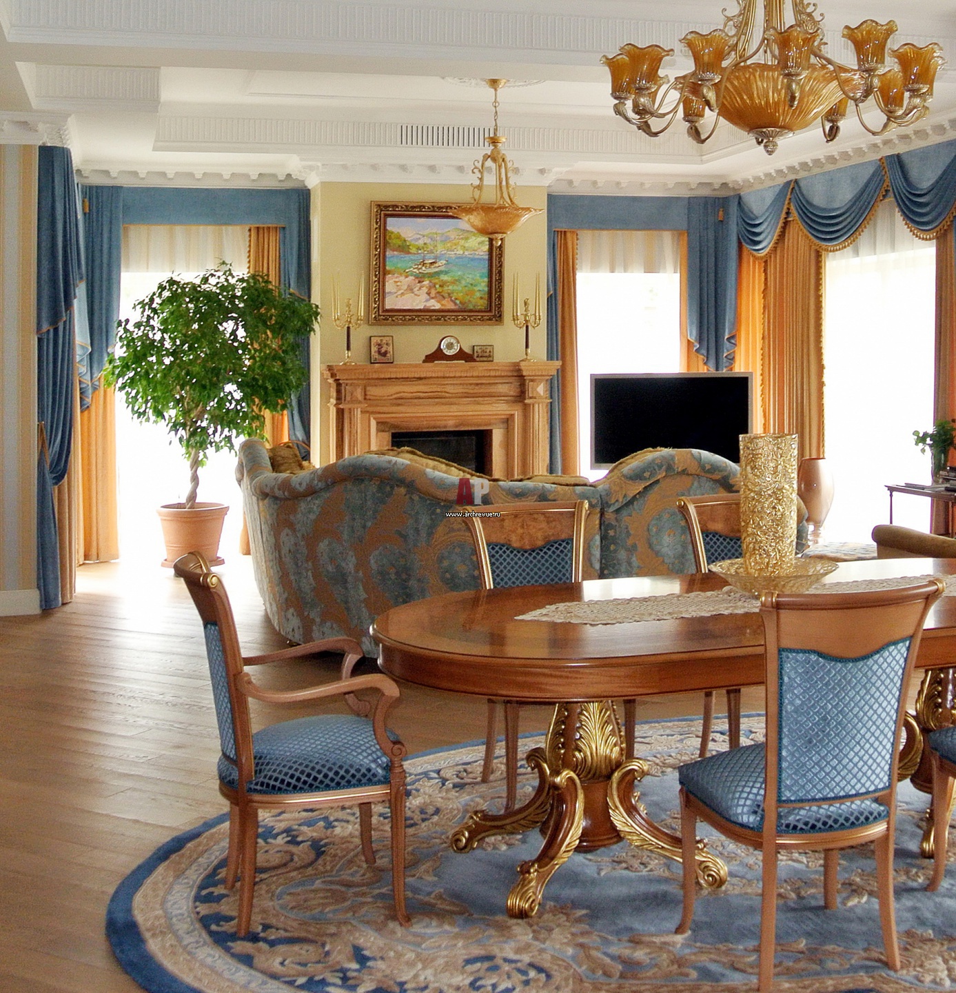 Фото интерьера классической гостиной загородного дома с бассейном и патио.