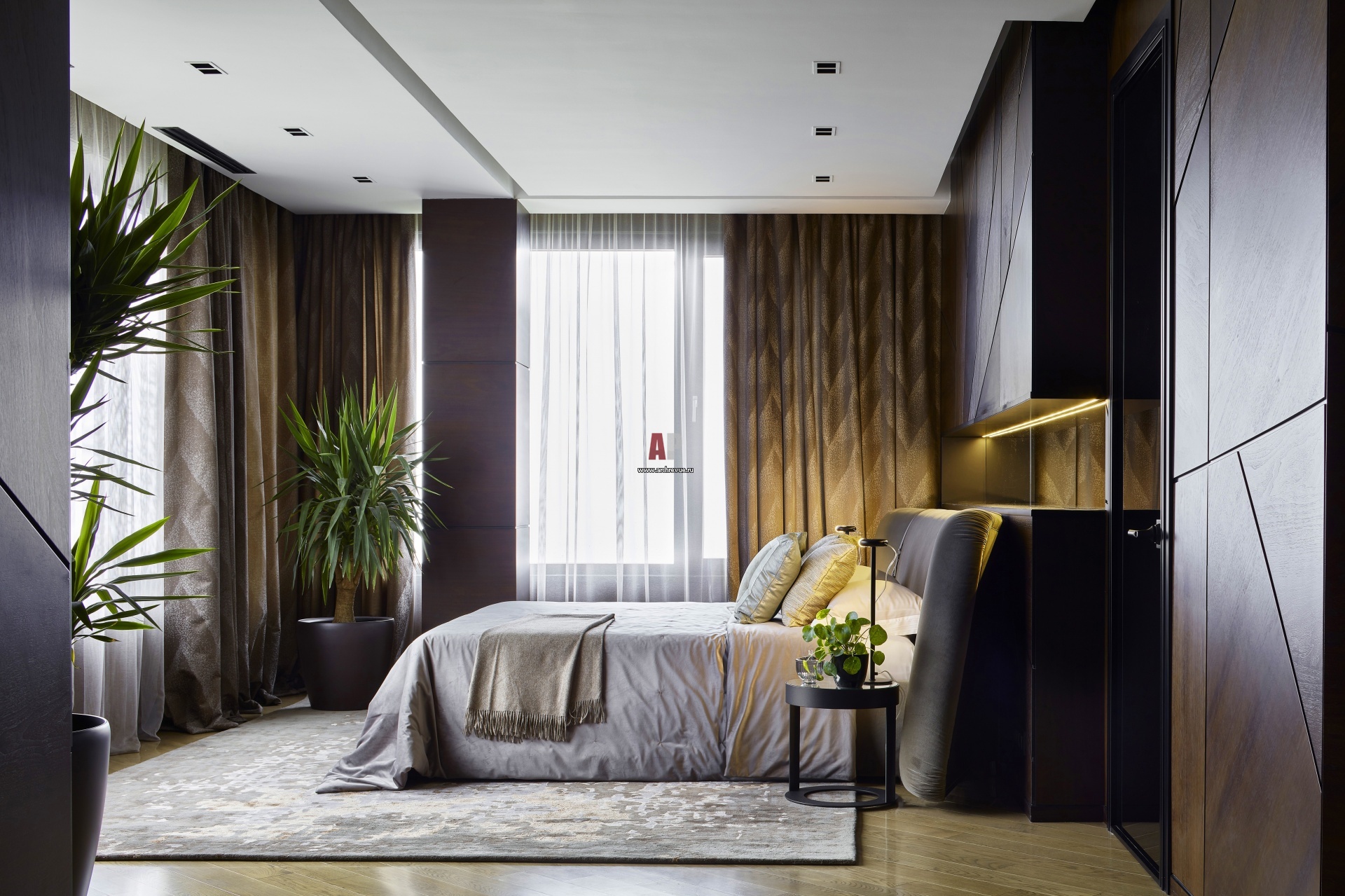 Стены хозяйской спальни зашиты панелями из шпона ореха, раскладка панелей повторяет диагональный рисунок штор. Кровать, Meroni & Colzani. Диван, пуфы, столики. Frigerio.