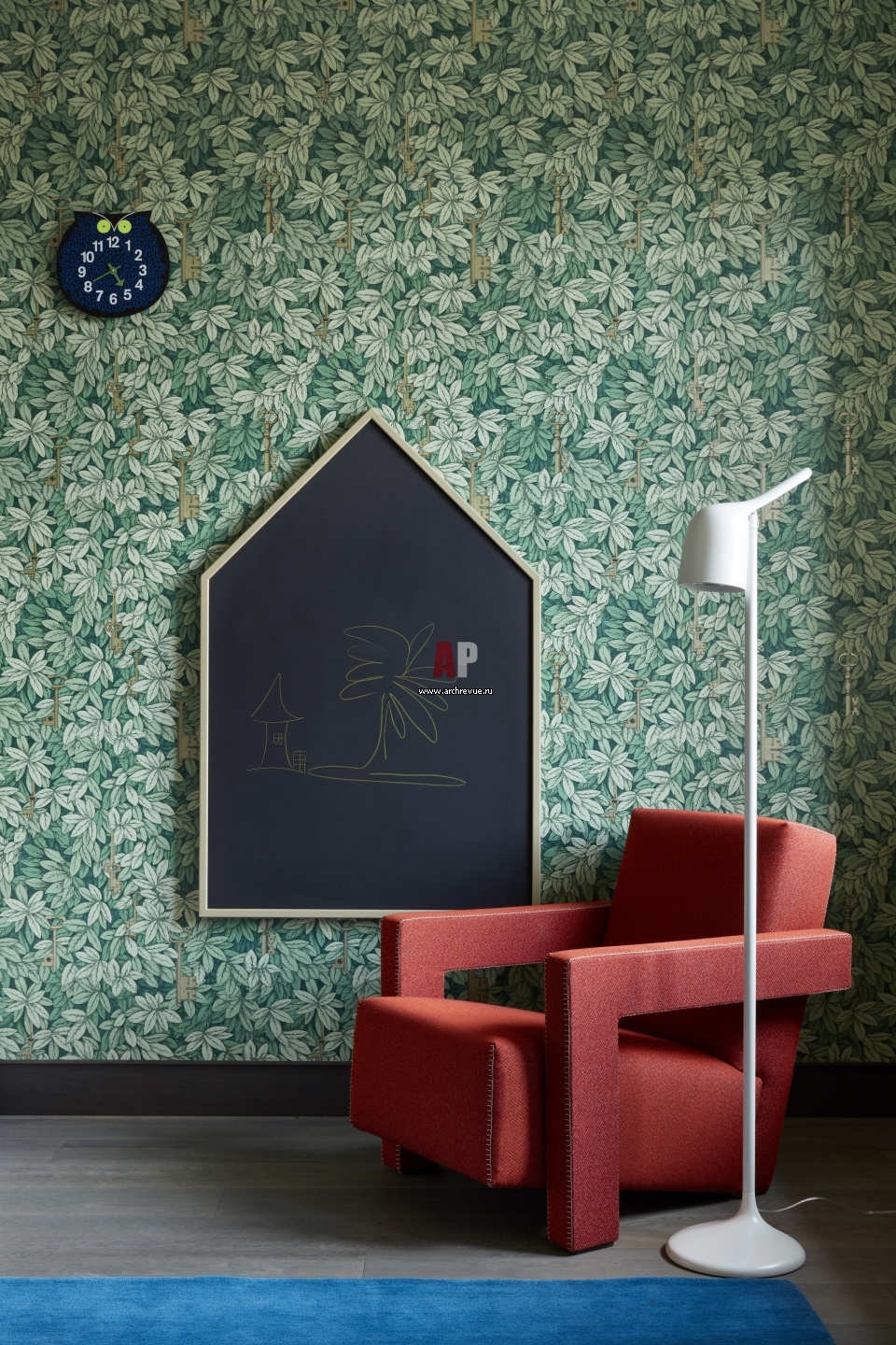 Интерьер детской. Обои Cole & Son. Красное кресло Cassina, модель Utrecht. Торшер, Foscarini.