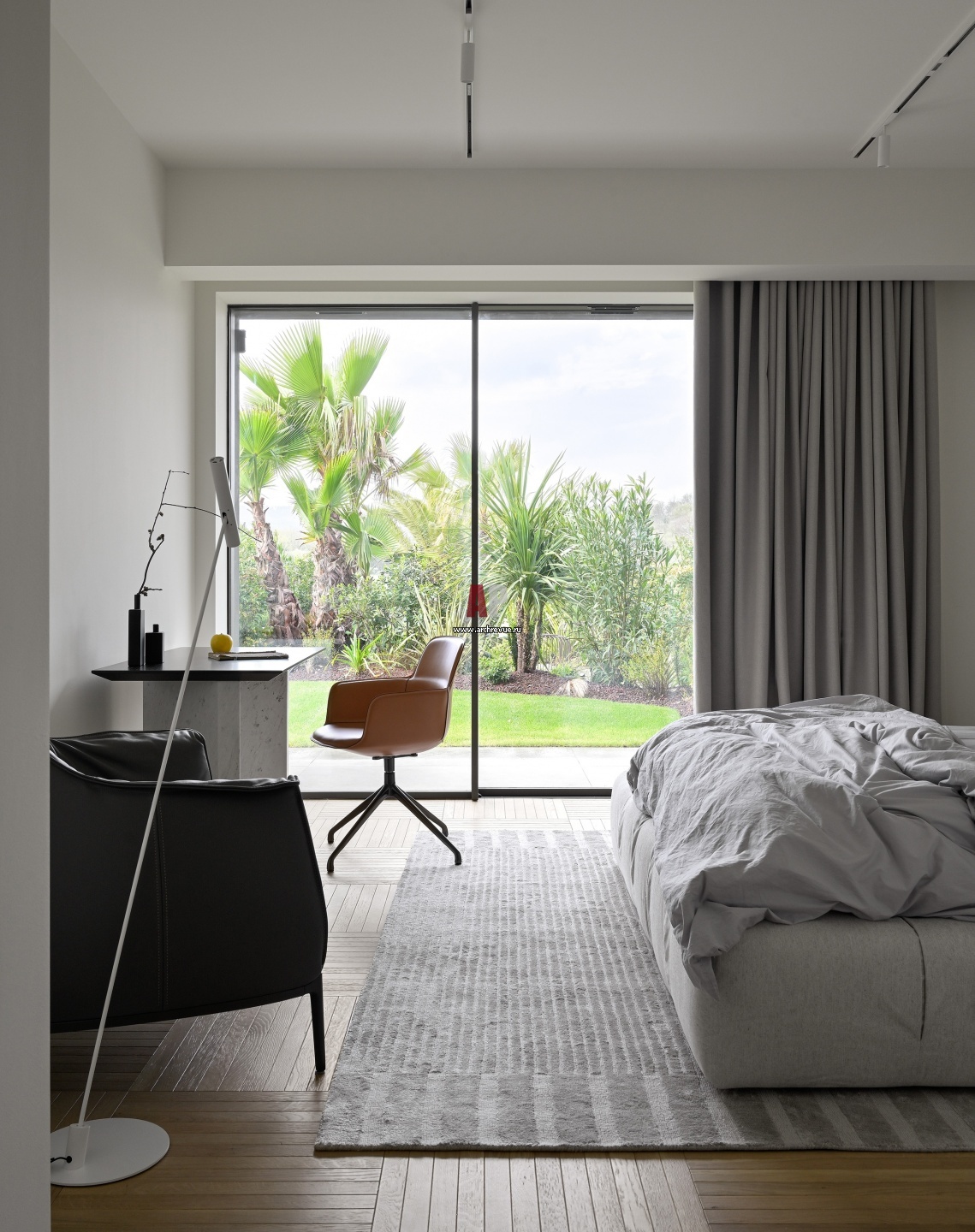 В каждой из трех детских спален есть зона сна, рабочая группа и свой санузел. Стол с деревянной столешницей отделан черным матовым лаком, ножки выполнены из мрамора Calacatta. Стул, Molteni& C.