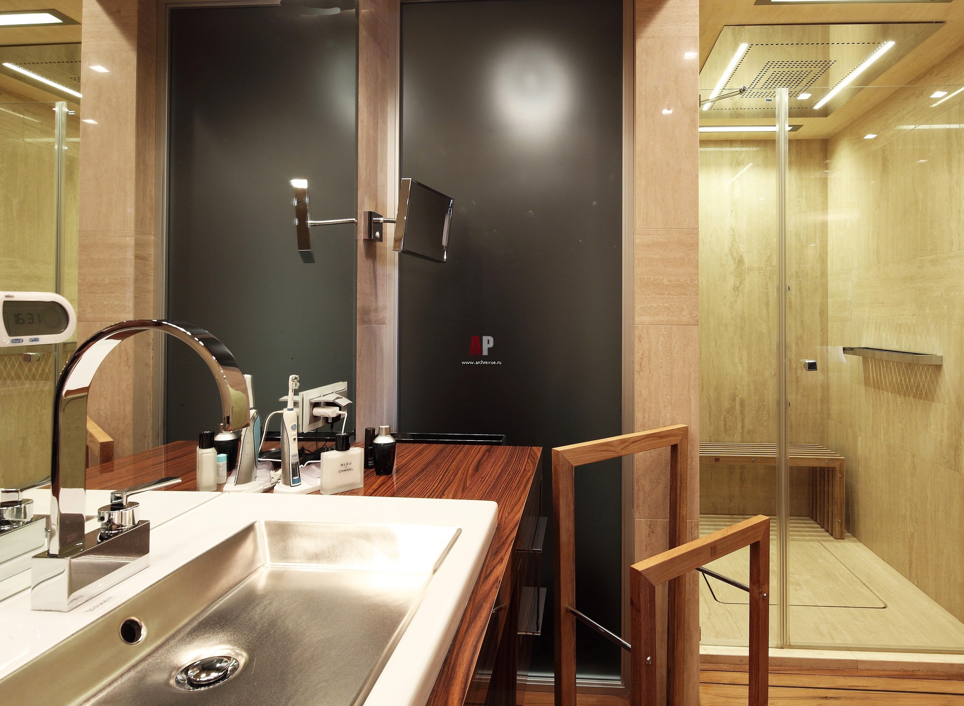 На фото – дизайн ванной в современном стиле с деревянной отделкой. Сантехника, Duravit. Душевая лейка в оснащении душевой кабины, Dornbracht.