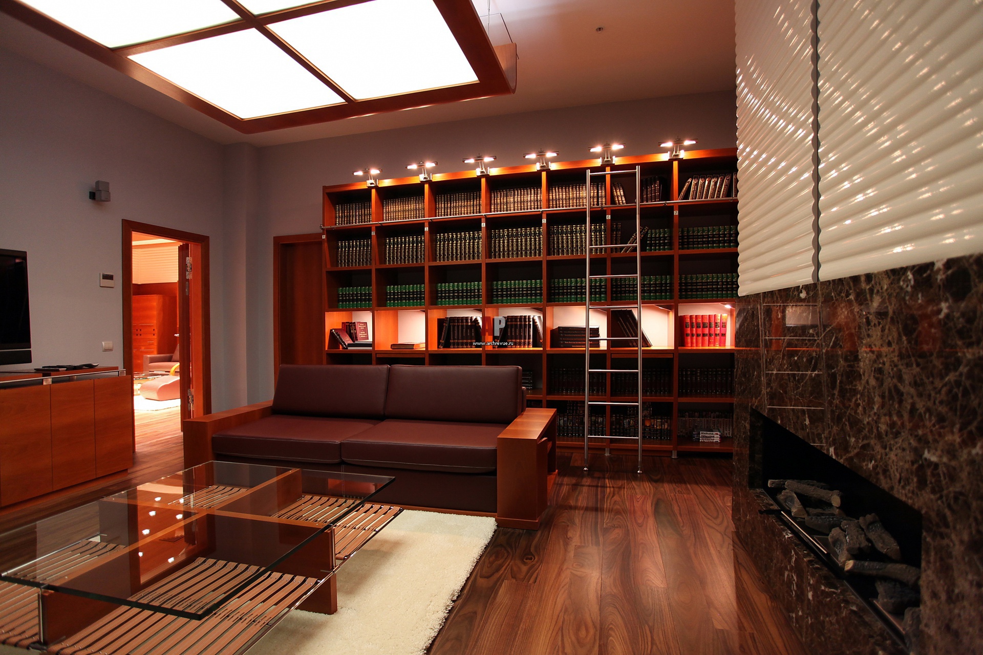 Зона отдыха в современном стиле. Библиотечный стеллаж сделан на заказ. Для удобства в каркас вмонтирована металлическая лестница, передвигающаяся по направляющей.