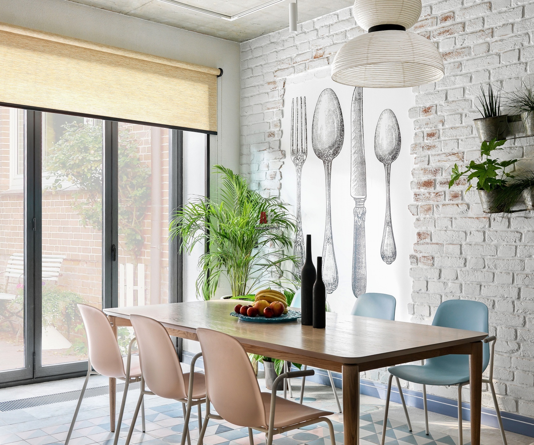 Стандартное окно в столовой дизайнер заменила на панорамное окно-гармошку Schuco. Оно обеспечило выход в сад и наполнило помещение естественным светом.