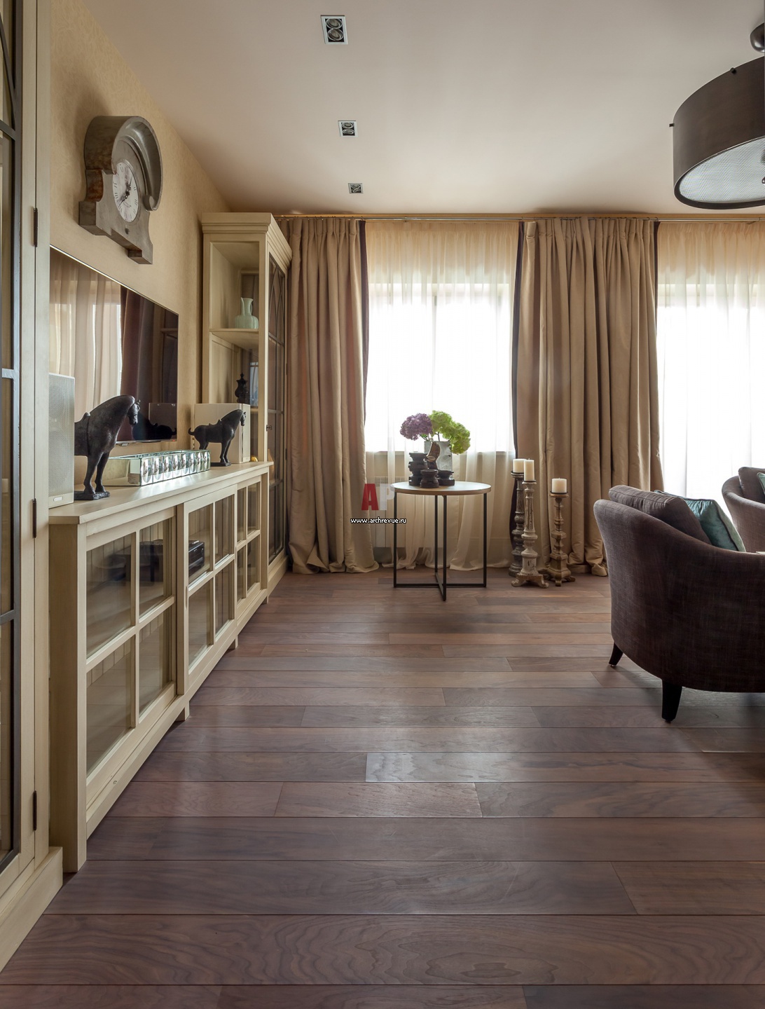 Интерьер гостиной выдержан в теплых спокойных цветах. Полы жилых помещений выстланы широкой паркетной доской с красивой фактурой, в мокрых зонах использован доломит.
