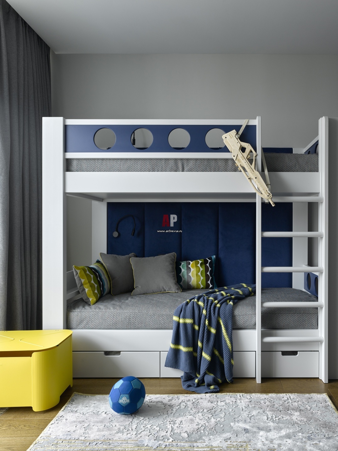 Респектабельная квартира в ЖК «Баркли Парк». Интерьер детской. Двухъярусная кровать сделана на заказ.