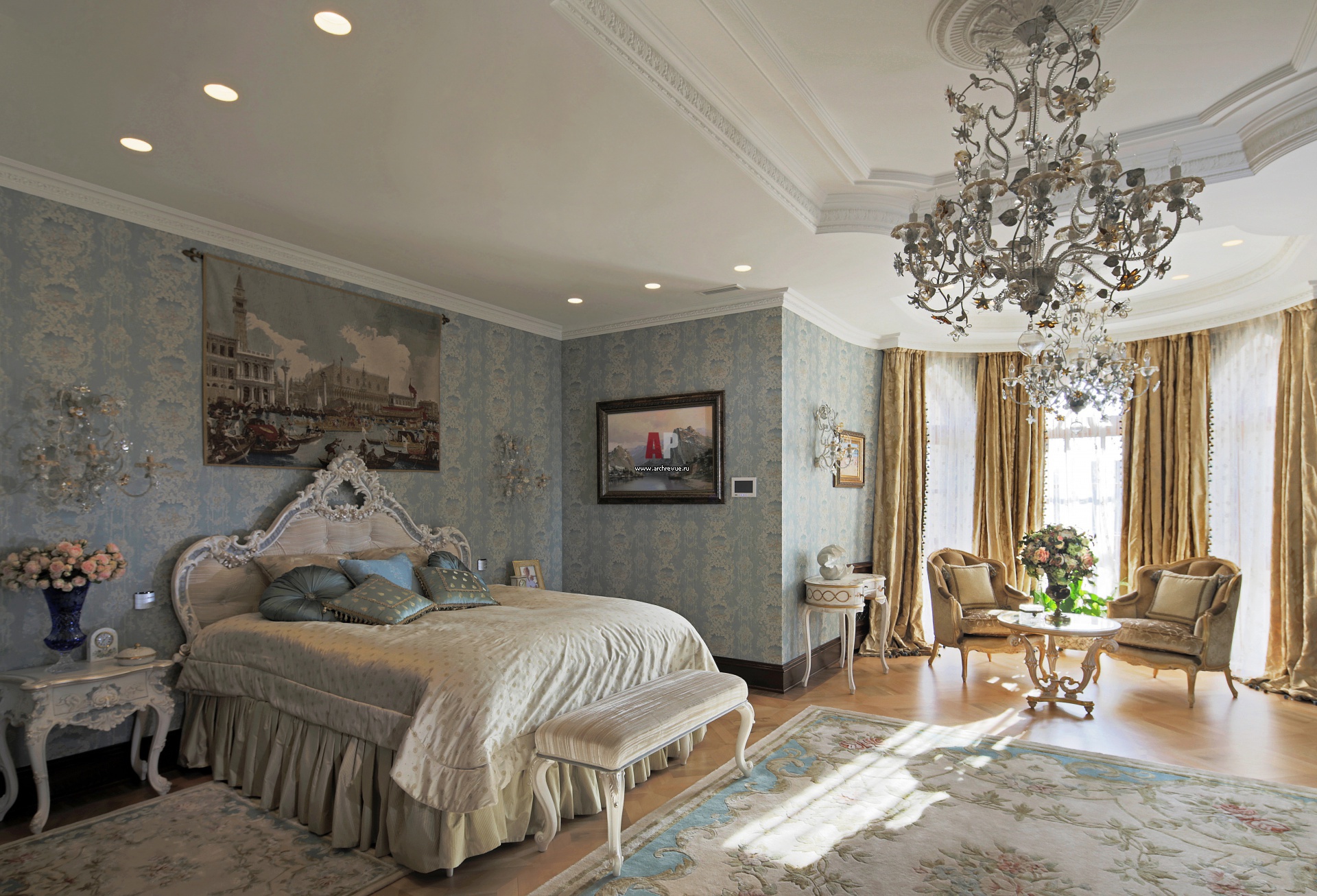 Интерьер спальни в дворцовом стиле с полукруглым эркером. Стены оформлены обоями ручной работы королевского голубого оттенка с золотым тиснением. Кровать, пуф, кресла, столик, Galimberti Nino. Цветочные люстры, Banci Firenze. Вся мебель, свет, аксессуары – поставщик Charles.Cameron.