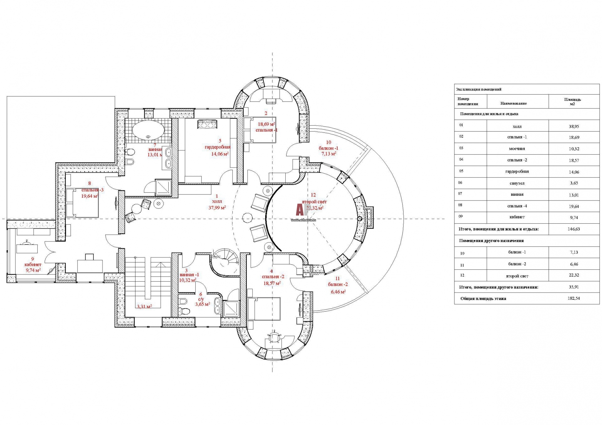 План первого этажа трехэтажного дома с округлыми эркерами.