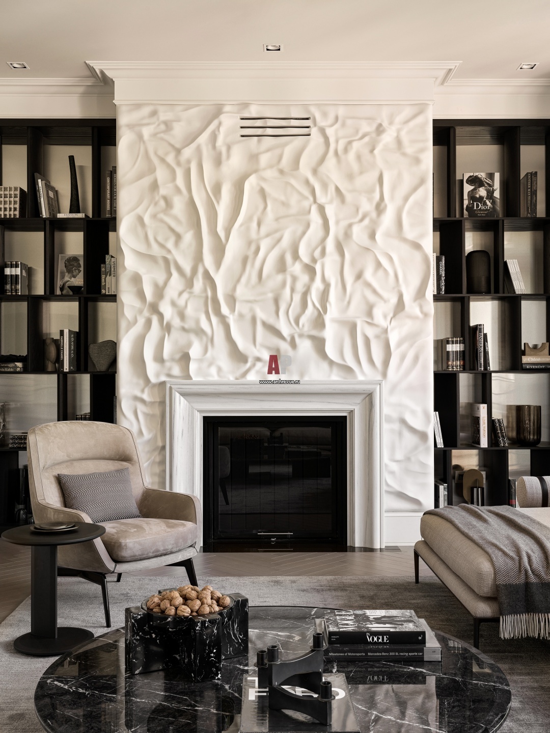 Гостиная со скульптурным камином из гипса. Кресло, Minotti. Шкафы, шкаф для ТВ из темного дерева изготовлены на заказ по эскизам дизайнеров.