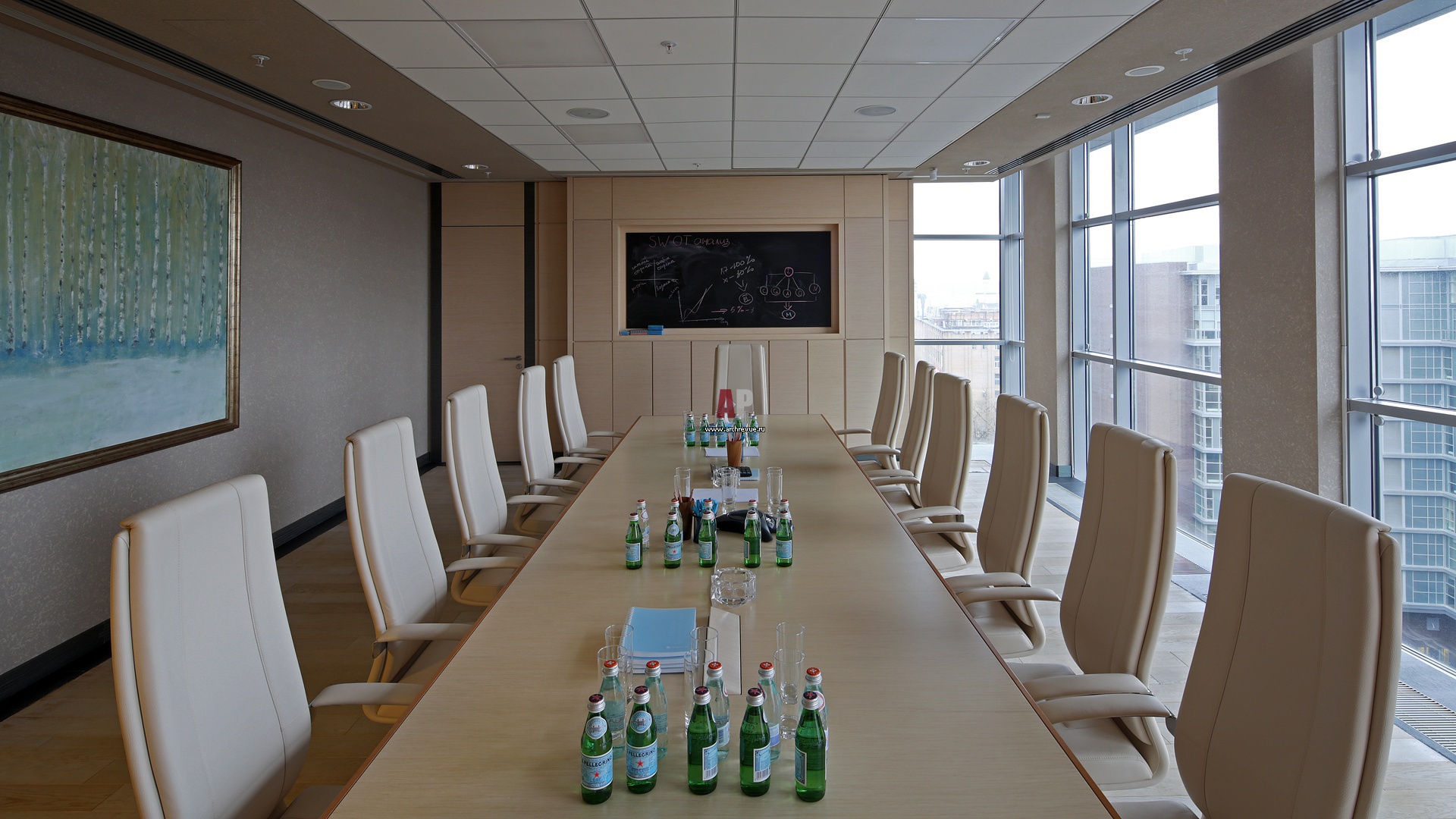 Стены в переговорной зашиты панелями из выбеленного дуба. Переговорный стол сделан на заказ. Кресла из кожи цвета топленого молока.