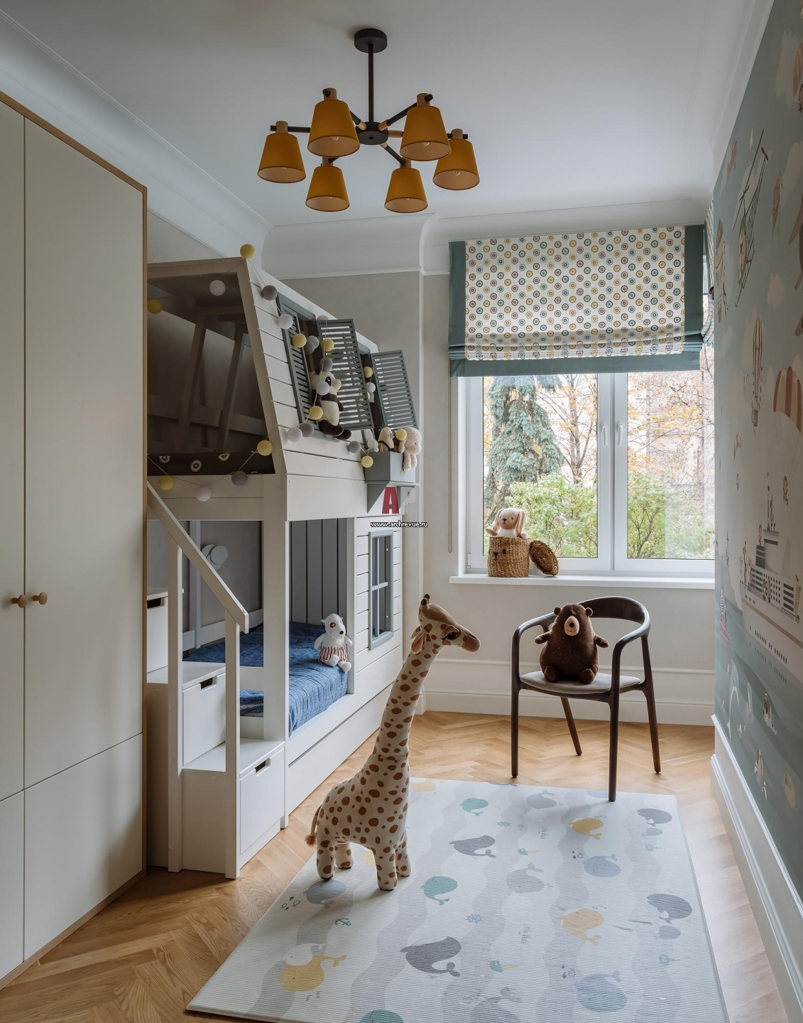 Детская. Кровать с чердаком и встроенная мебель выполнены на заказ по эскизам дизайнера.