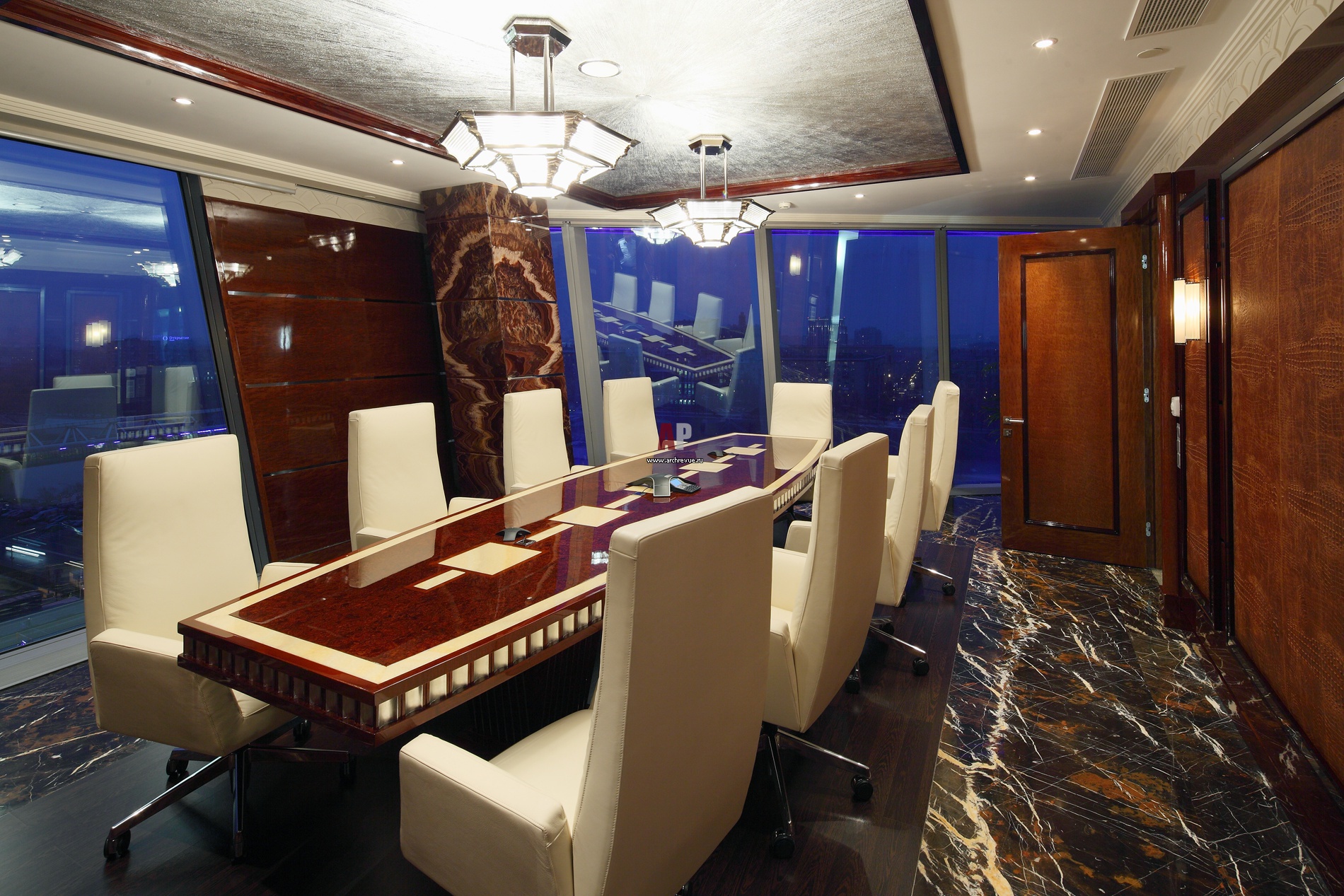 Переговорная имеет сложную конфигурацию. Согласно задумке архитектора здания стеклянные витражи расположены под углом, что придает интерьерам современный вид.