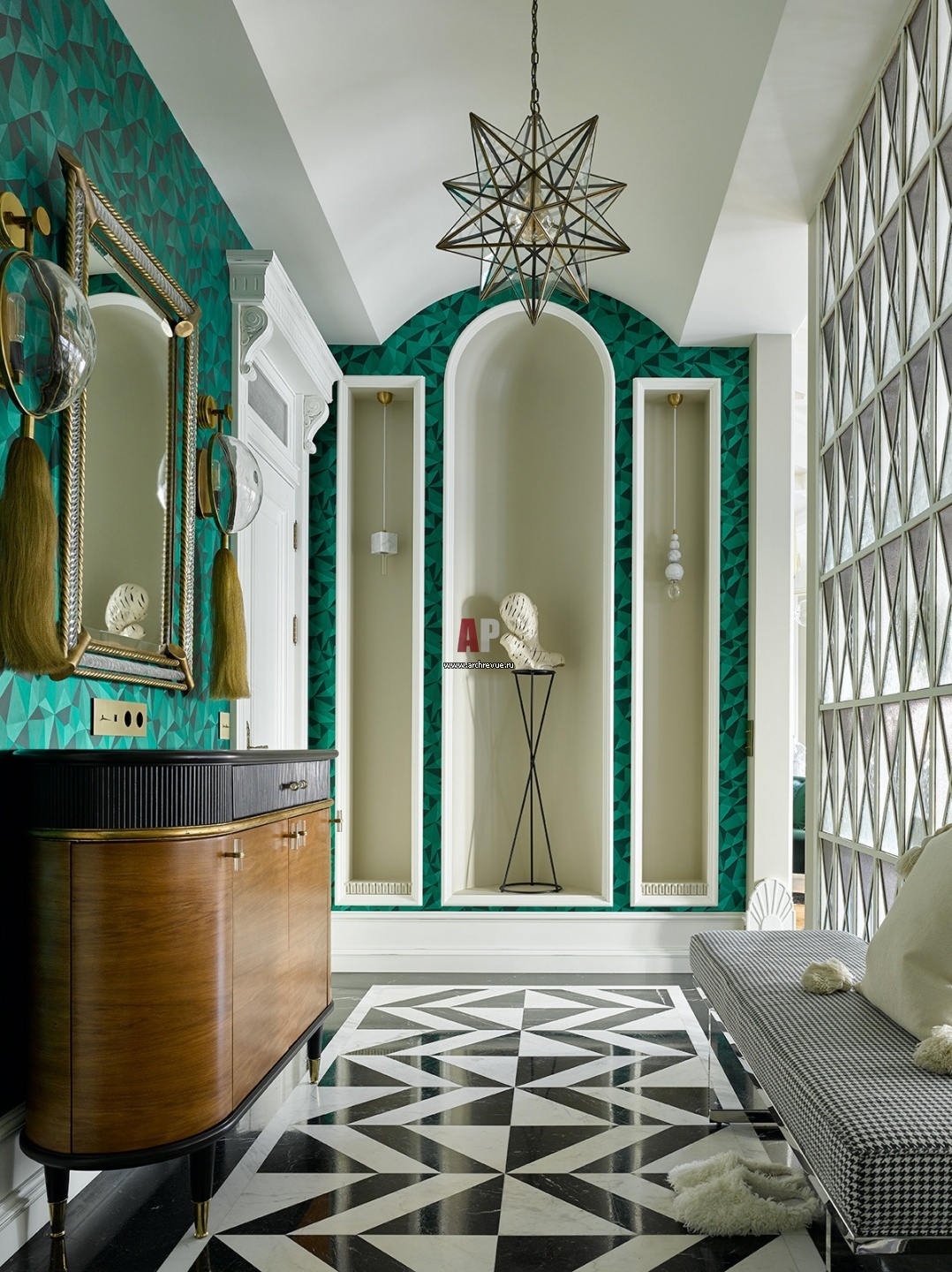 Прихожую украшает арочный свод и ниши для скульптур. Пол облицован мозаикой из натурального черно-белого мрамора, на стенах – обои ярко-зеленого цвета. Комод сделан на заказ. Люстра, Laudarte.