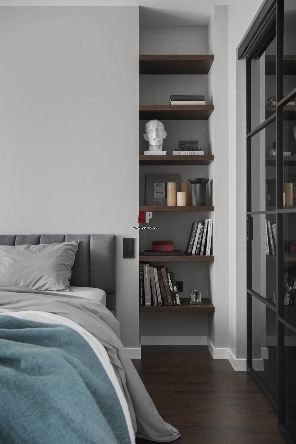 Интерьер спальни. Встроенные шкафы помогают корректировать непростую геометрию помещений и маскировать острые углы.