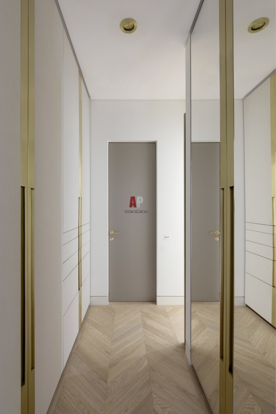 Белая квартира в дореволюционном доме в центре Москвы. Интерьер коридора. На полу – паркет, укладка «елка», беленый дуб. Дверная и мебельная фурнитура Buster + Punch.