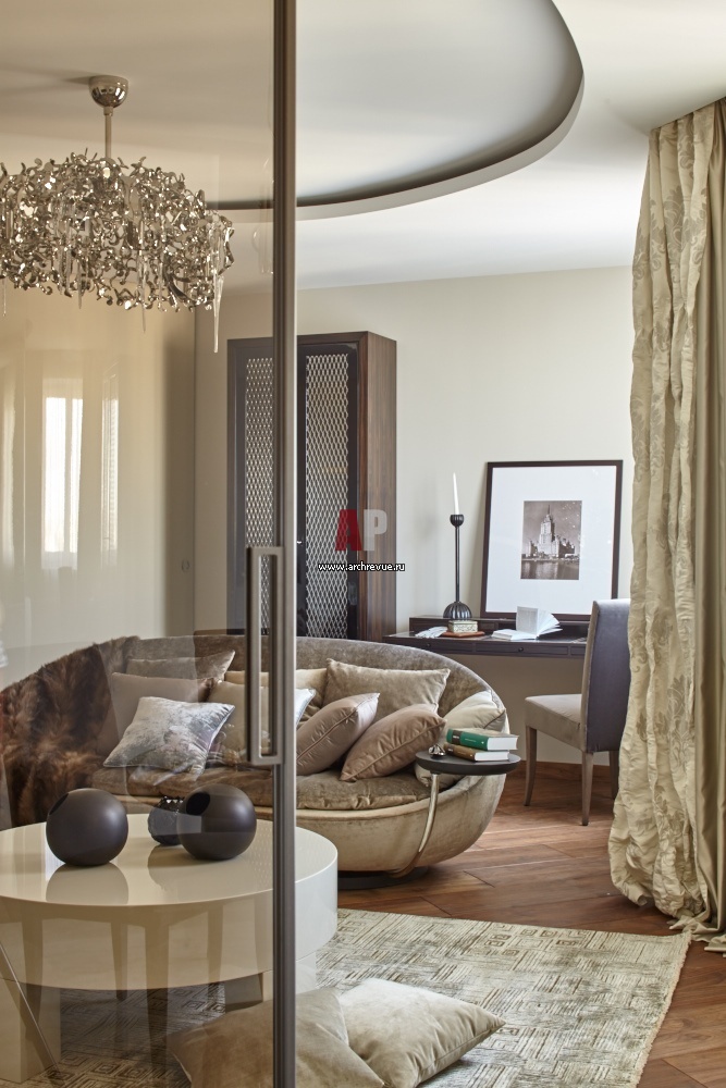 Вид на рабочую зону в гостиной через дымчатую стеклянную перегородку. Натуральные материалы и роскошные природные фактуры «утепляют» интерьер.