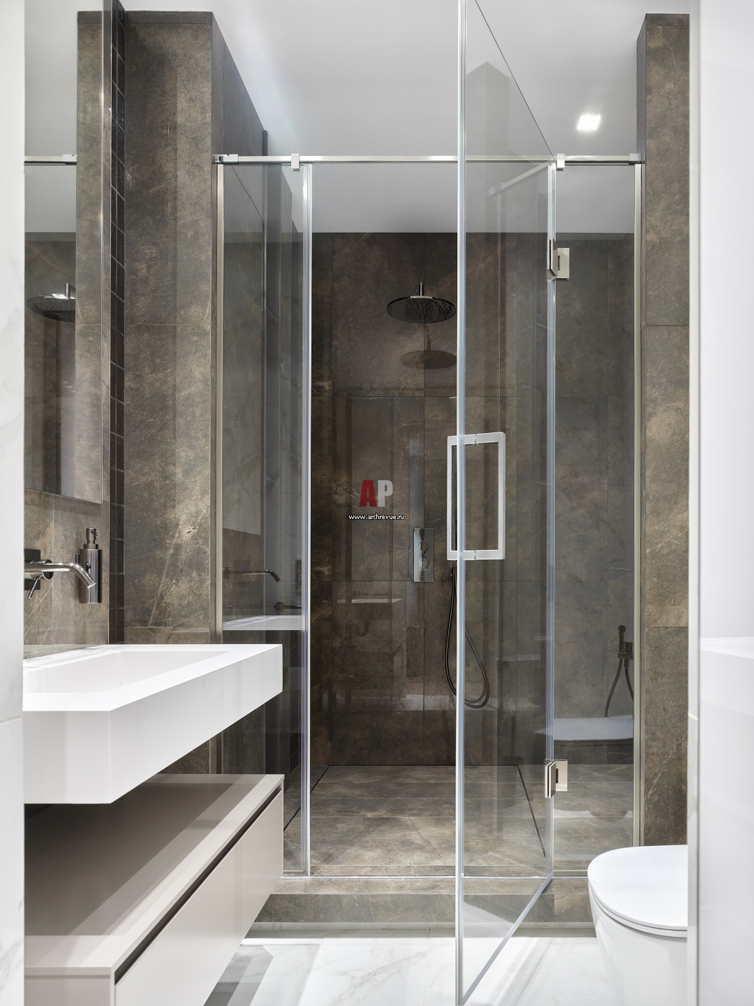 Гостевой санузел оформлен плиткой с брутальной фактурой натурального камня. Душевая кабина в строительном исполнении.