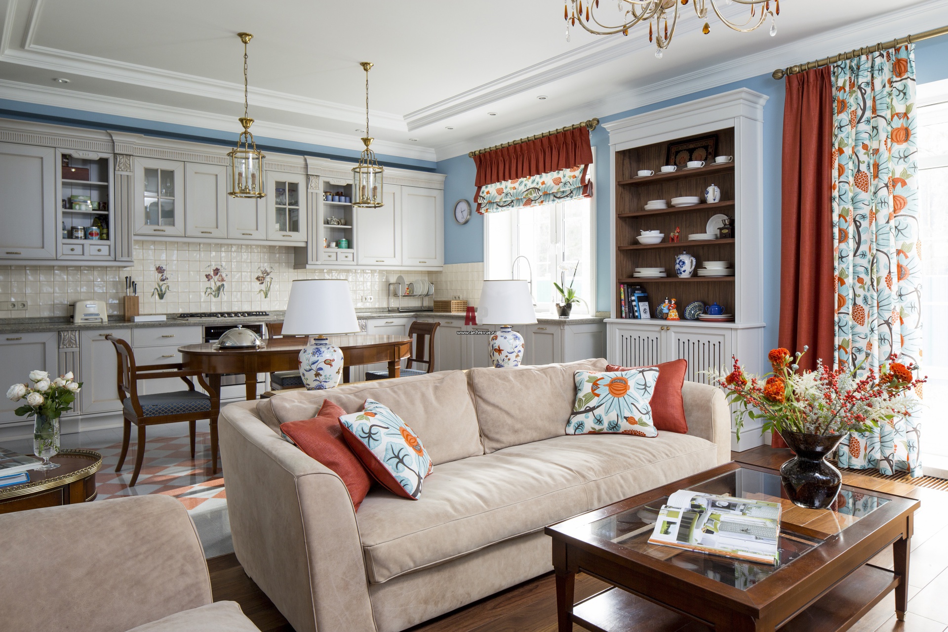 Объединенная гостиная-кухня. Диваны с текстильной обивкой, Ulivi Salotti. Журнальный столик, Provasi. Витрина из белого дерева с темным задником сделана на заказ.