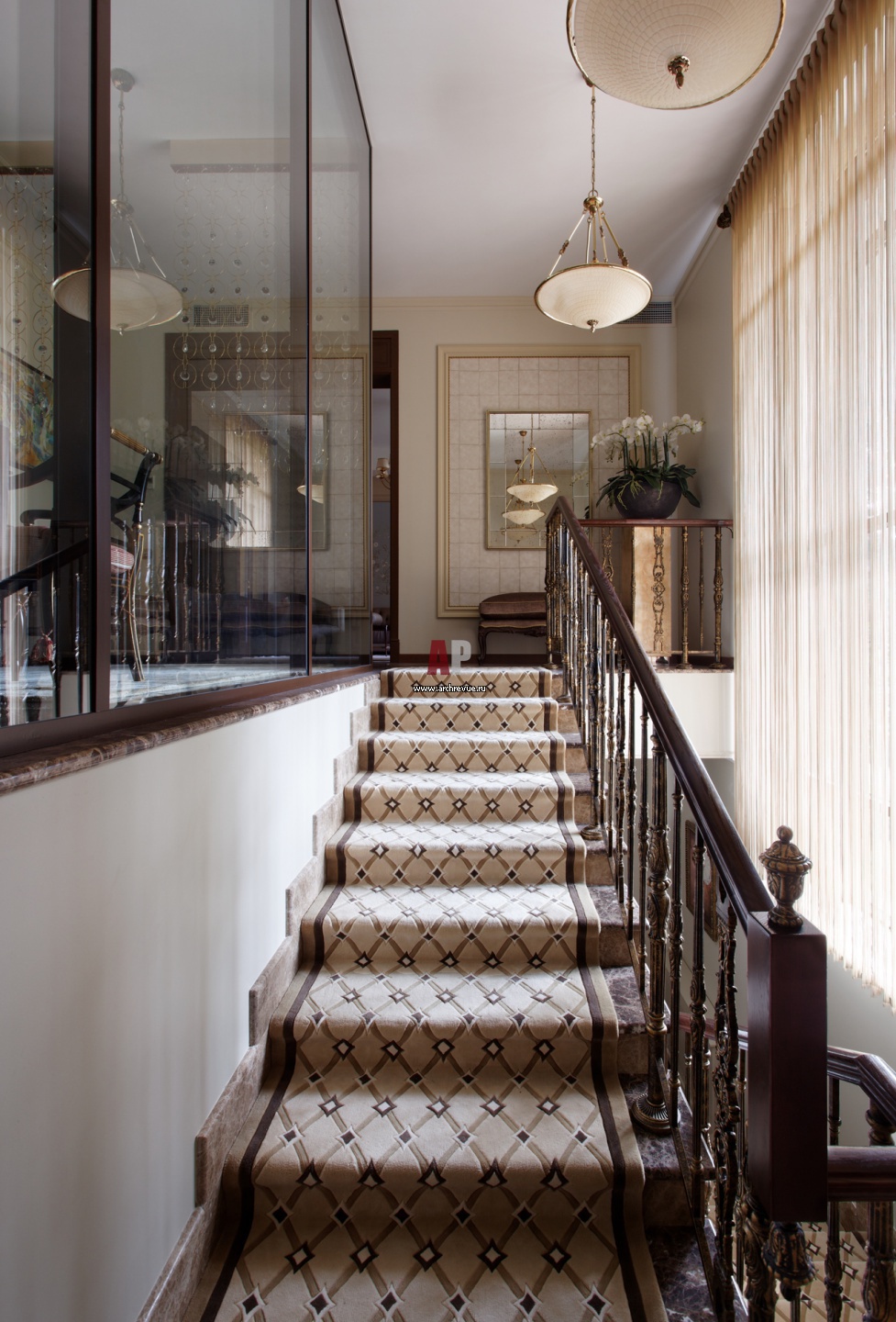 Лестница на второй этаж оформлена балясинами Grande Forge (Франция), серия «Художественное литьё», поставщик Mercury Forge. Они выполнены из специального серого чугуна марки GS (Graphite Spheroidal) методом литья под давлением, финишное покрытие с ручным нанесением патины. Поручень (дуб, тонировка) собственного производства, Mercury Forge.