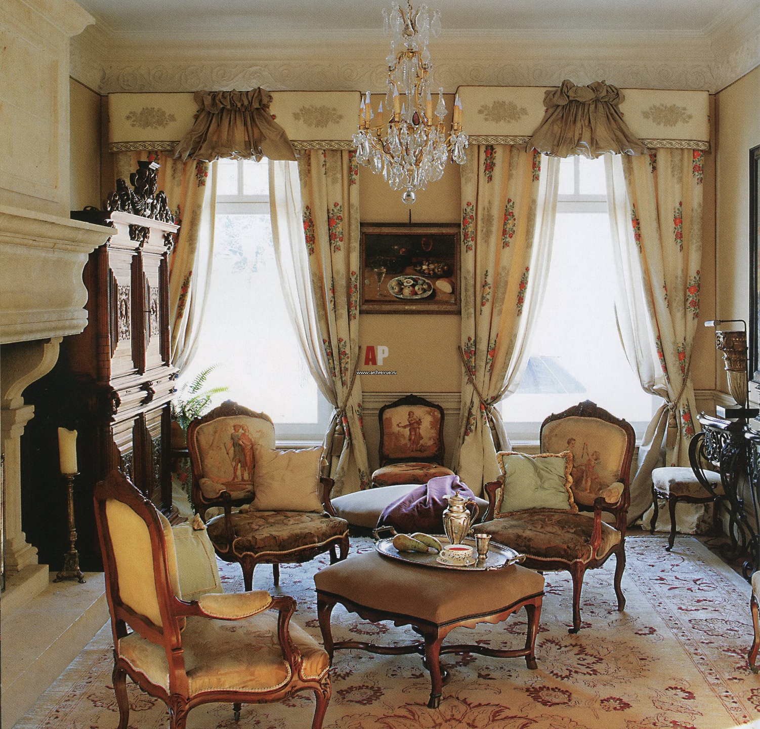 Фото мягкой зоны в гостиной. Шторы в доме – копии старинных. В основе оформления окон – рисунки из исторических и художественных энциклопедий.