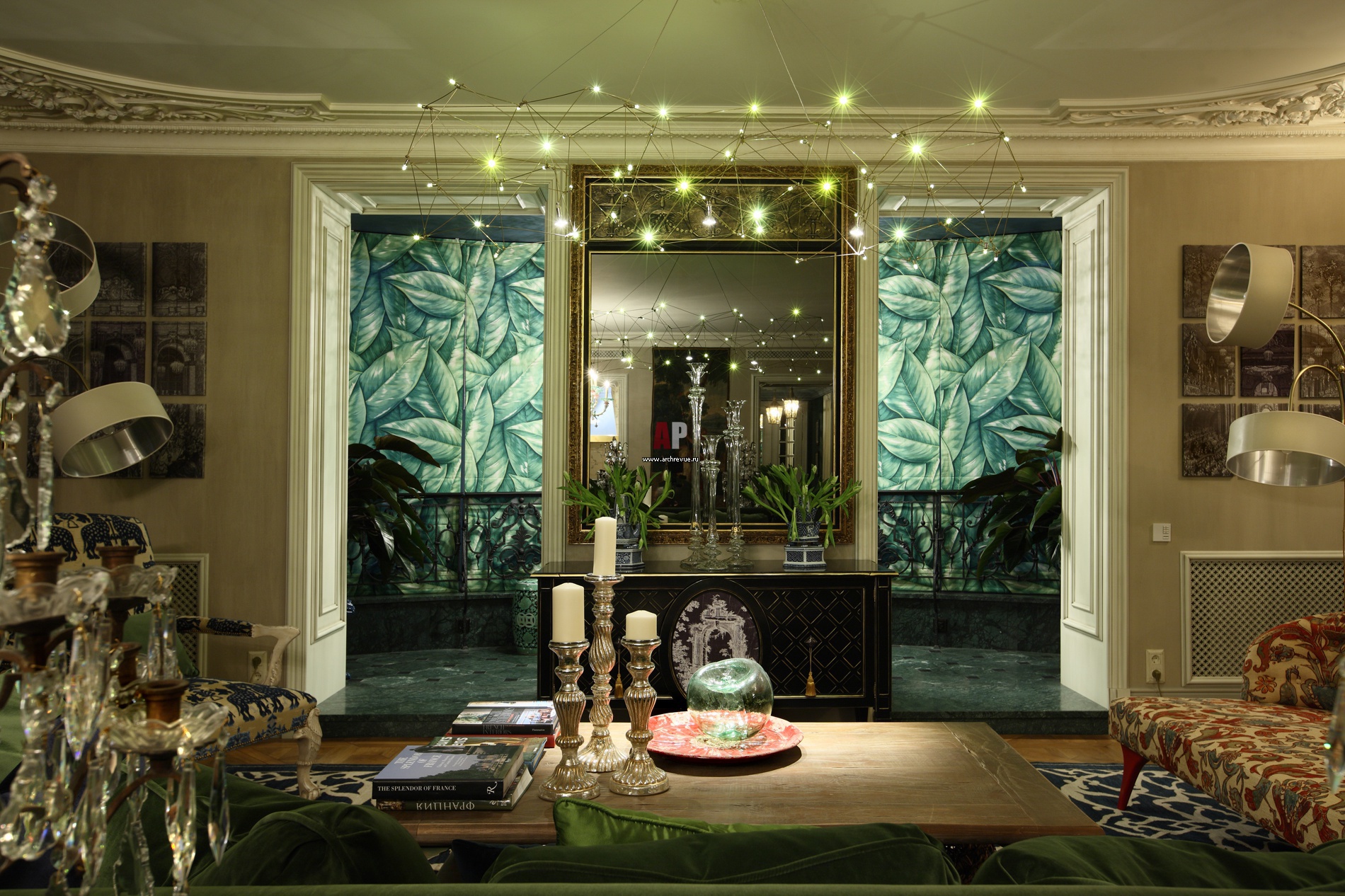 Гостиная. Зеркало на самом деле оказывается телевизором марки Ad Notam, колонки и сабвуфер Bang & Olufsen скрываются за гравюрами в углу комнаты и комоде, выполненном по проекту декоратора.
