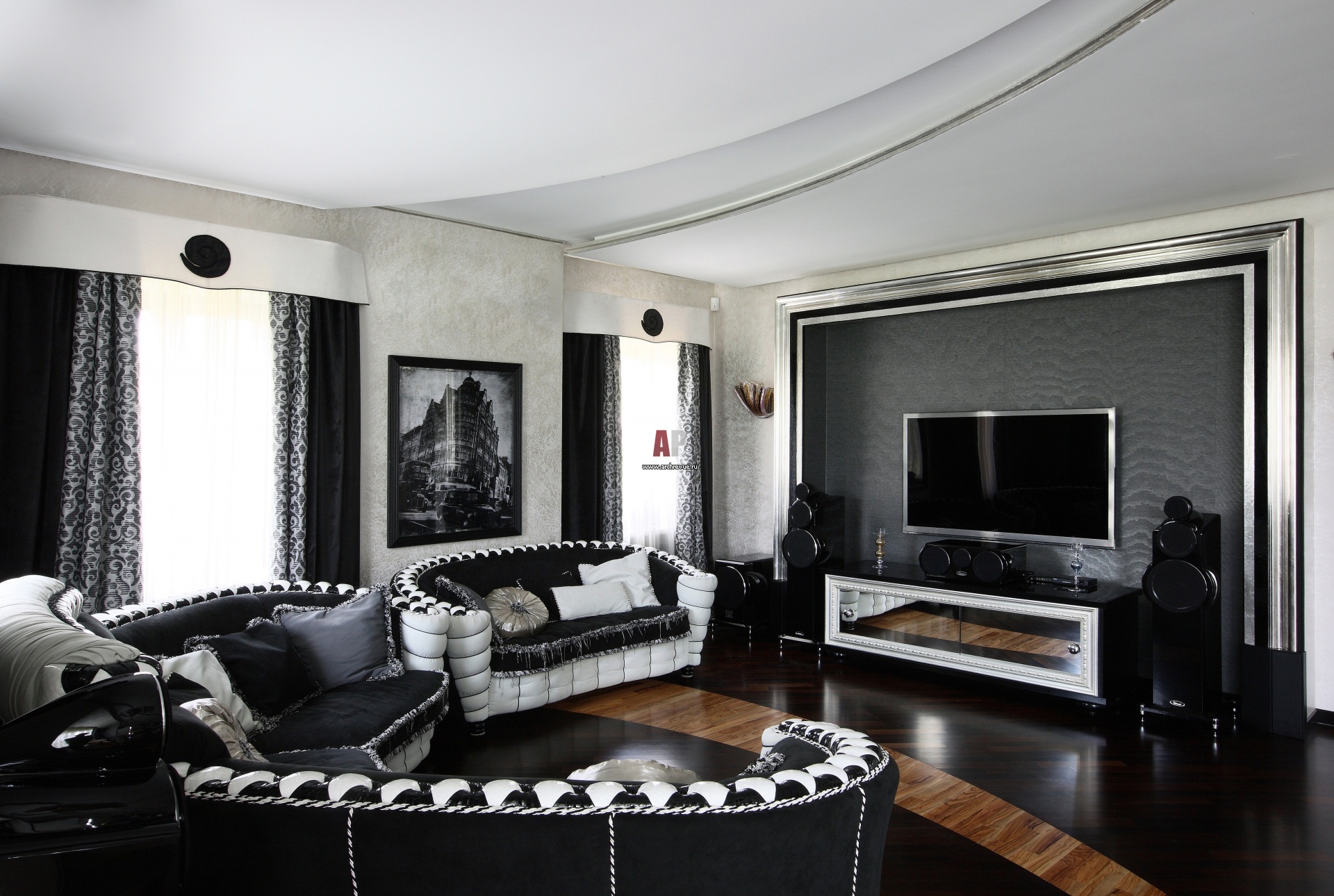 Интерьер гостиной выдержан в контрастной цветовой гамме. Стены оформлены художественной штукатуркой с перламутром, благодаря чему меняет оттенок в зависимости от угла зрения и освещения. Диванная группа, Maison Santamaria.