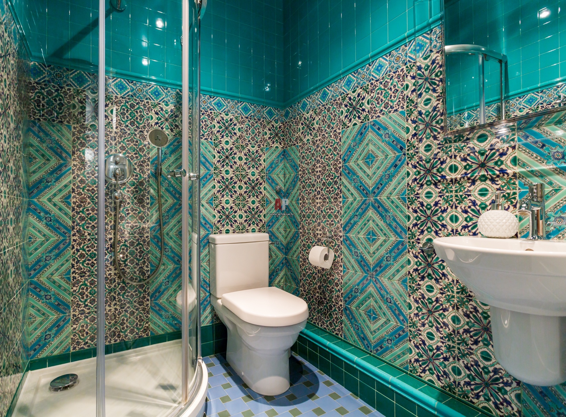 Детская ванная комната облицована панно из плитки Mosaic del Sur и Doremail с этническим орнаментом. Керамическая плитка Doremail (низ - коллекции LES TUNISIENNES и LES ORIENTALES, сверху - однотонная плитка, коллекция LES UNIS), поставщик «Грета Вульф».