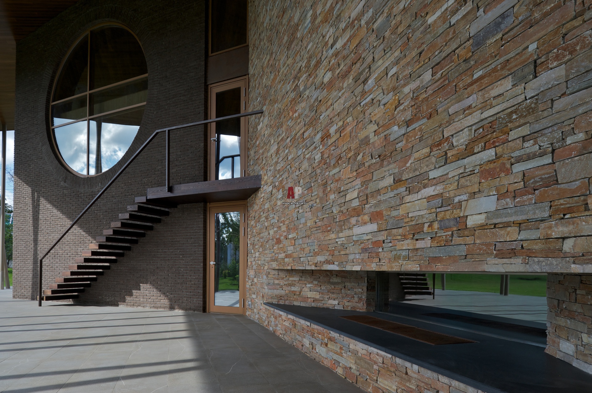 Наружные стены – многослойная кирпичная кладка с последующей облицовкой кирпичом и натуральным камнем.