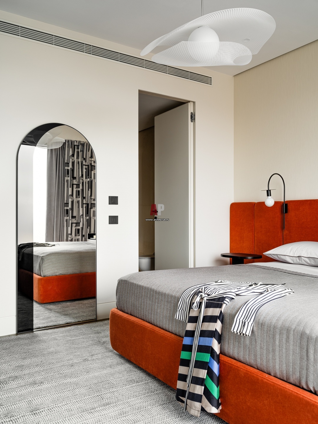 Сочный и дерзкий интерьер квартиры в московской высотке. Мастер-спальня с выходом в ванную комнату. Кровать обита тканью насыщенного оранжевого цвета.