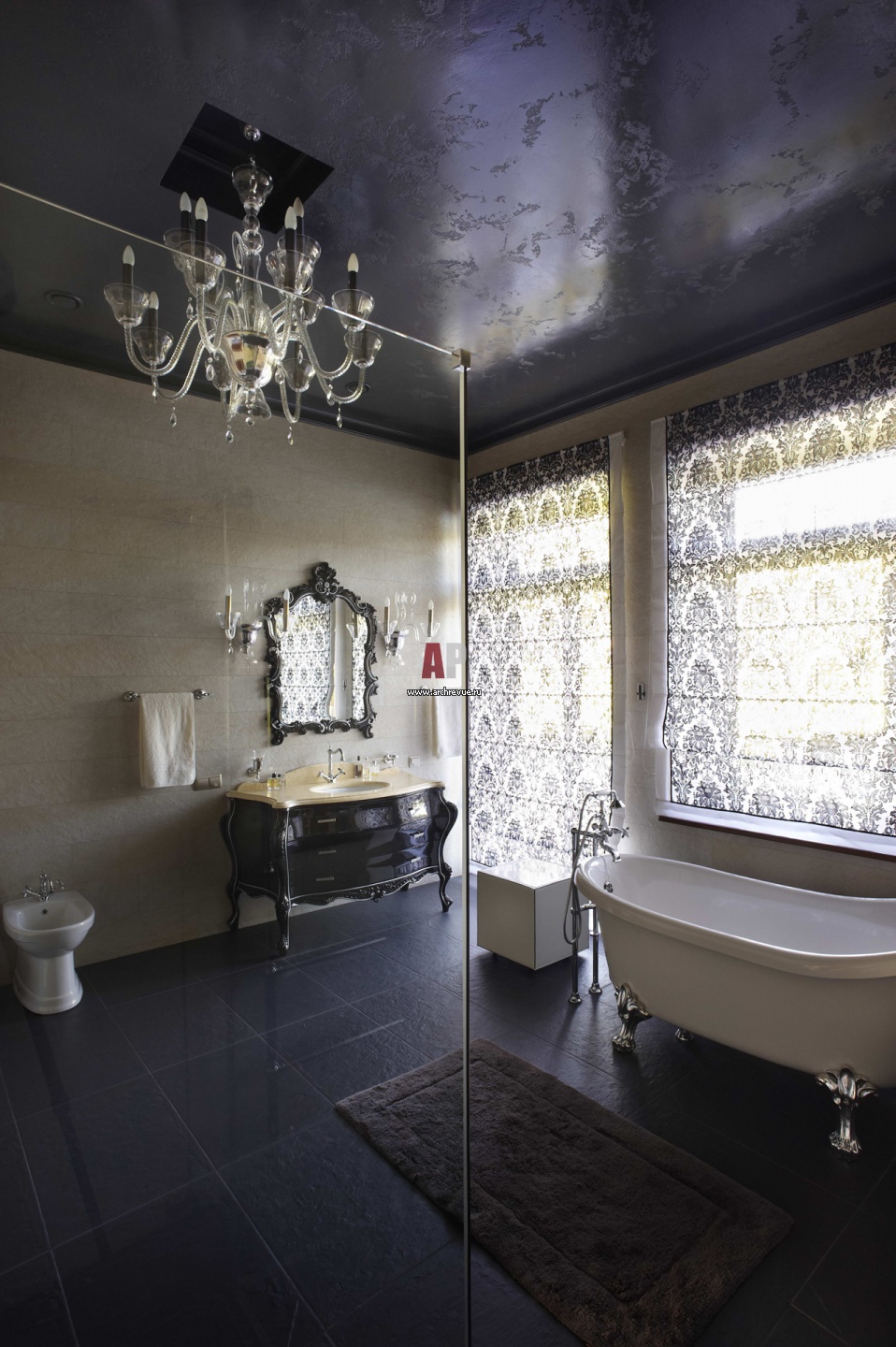 Интерьер ванной комнаты решении на контрасте черного потолка и пола и бежевых стен. Потолок покрыт декоративной штукатуркой с эффектом травертина и выкрашен в черный цвет. На полу – плитка с фактурой сланца.