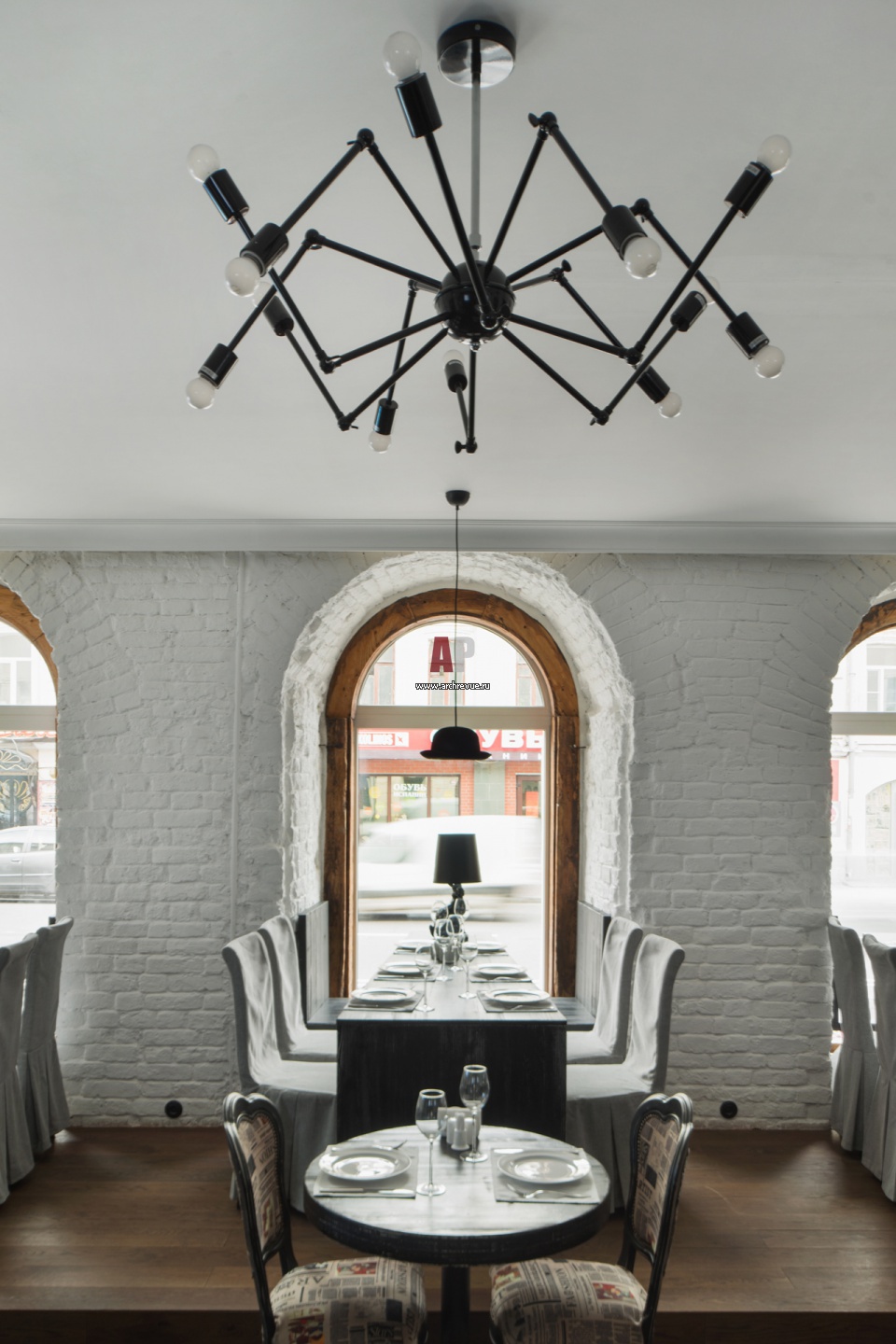 Столик на четверых возле окна. Широкий подоконник арочного окна выкрашен в черный цвет. Рамы из светлого дерева.