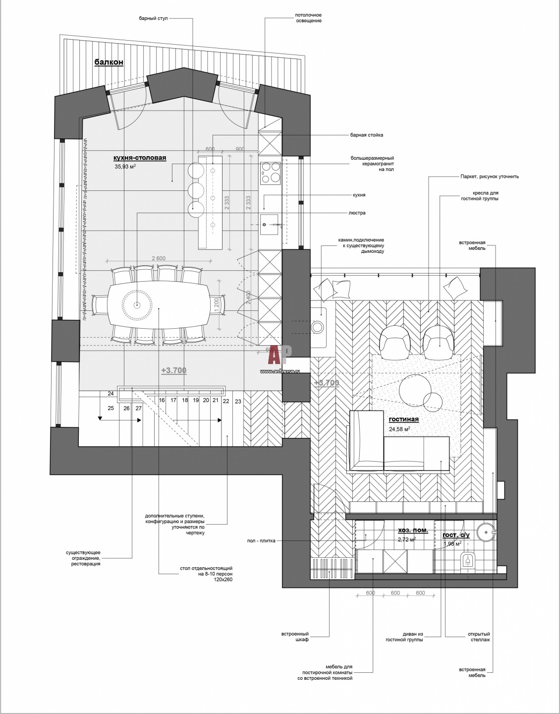 Планировка 2 этажа 4-х этажной реконструированной квартиры в историческом доме начала ХХ века.