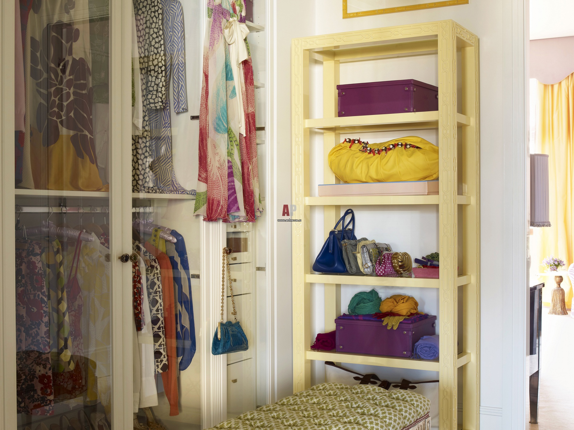 На фото – интерьер гардеробной. Встроенная мебель с стеклянными створками сделана на заказ. Потолок оклеен обоями, Schumacher.