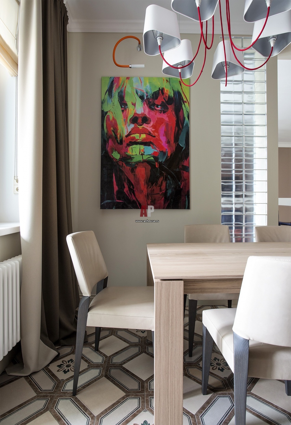 Зона столовой в современном стиле. Люстра над обеденным столом, Design Heure. На стене – авторская копия французской художницы Франсуазы Нилли.