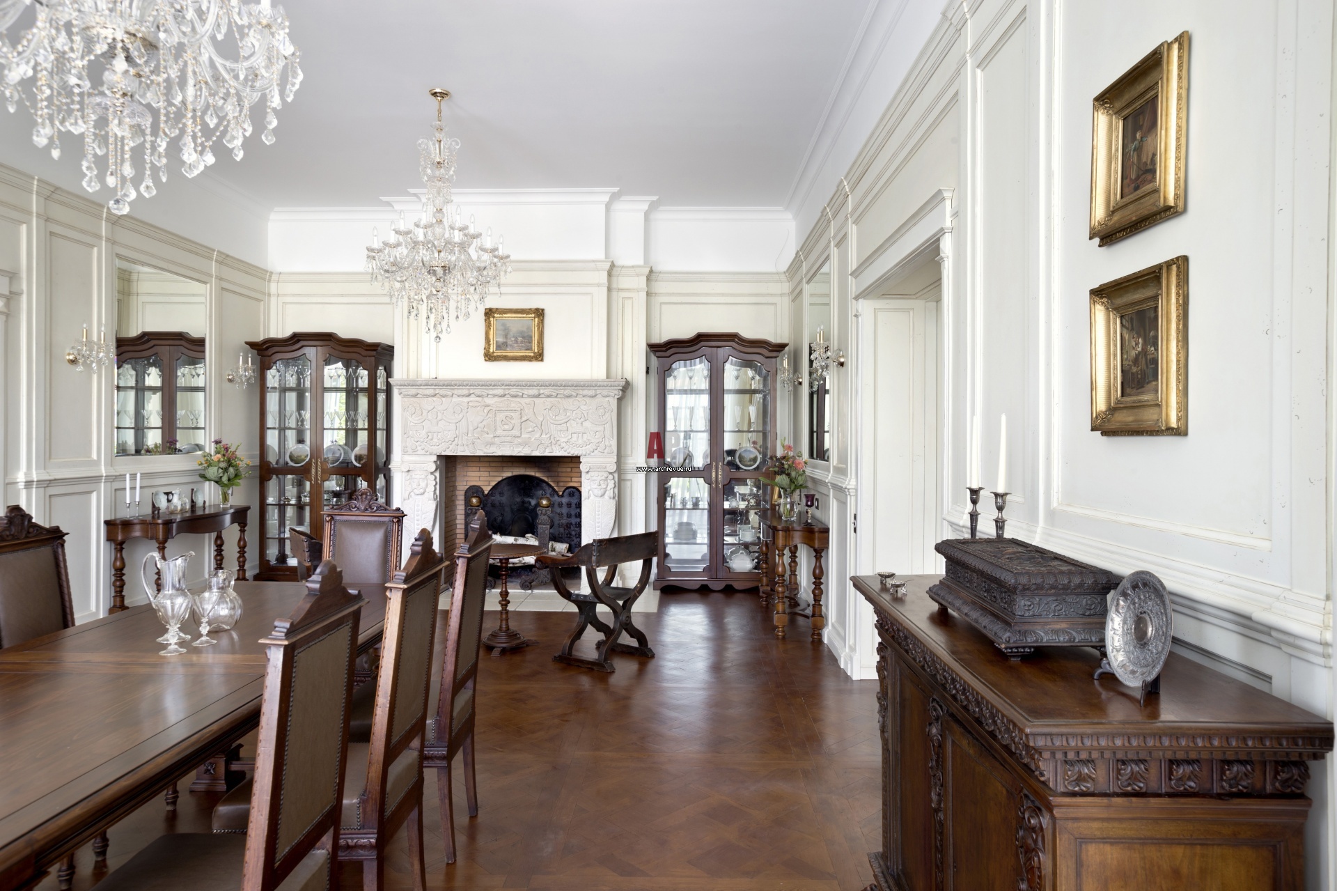 Каминный зал. Портал камина выполнен из известняка, его реальный прототип находится в замке Кавдор, Шотландия, построенном в 1600-х годах. Держатели для дров, чугунный Задник, антиквариат. Рядом с камином – антикварные кресла «Савонарола», середина XIX в.