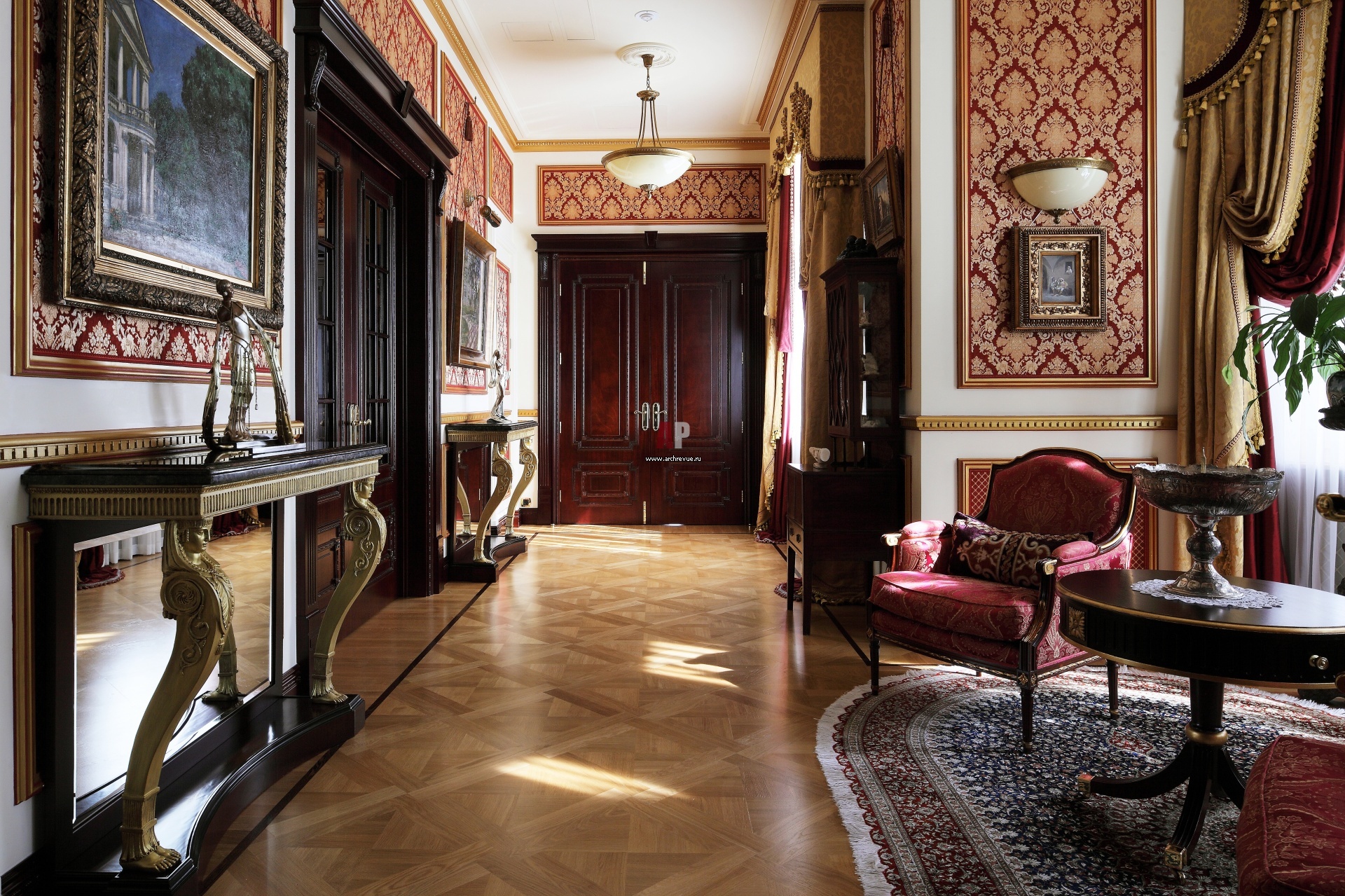 Интерьер холла в классическом стиле. На полу – наборный художественный паркет. Двери, порталы, полированный орех. На стенах – трафаретная роспись, имитирующая тканные буазери.