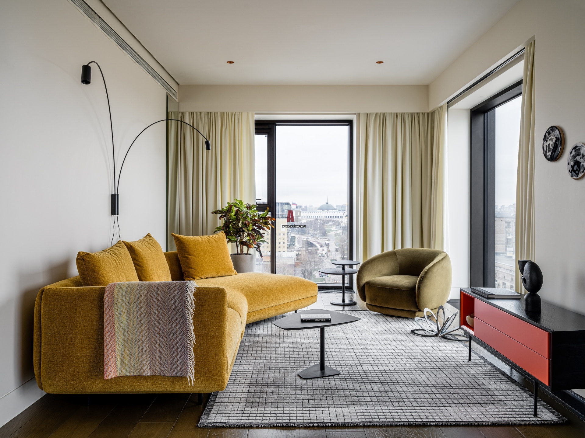 Гостиная с панорамным остеклением и угловым видом. Диван и креслo, BoConcept. Бра, Nemo. Искусство, Анна Ким.