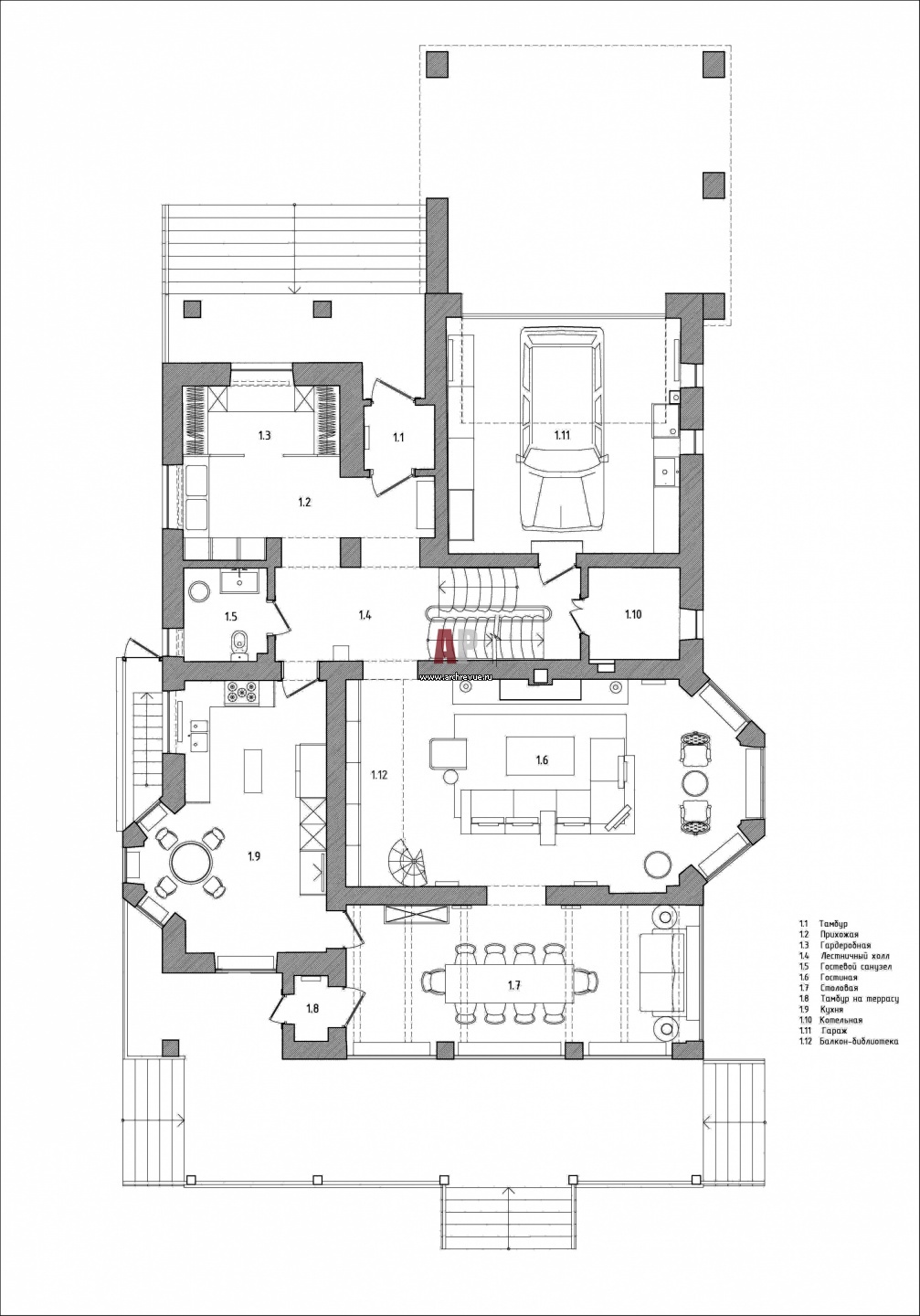 Планировка 1 этажа загородного дома.