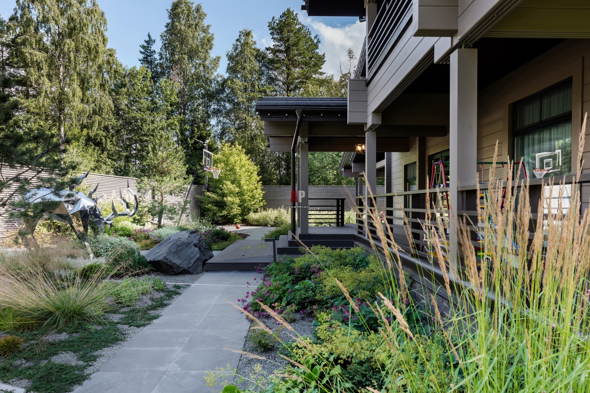 Участок вокруг дома оформлен в духе северных ландшафтов, характерных для районов ленинградской области, граничащих с Финляндией.