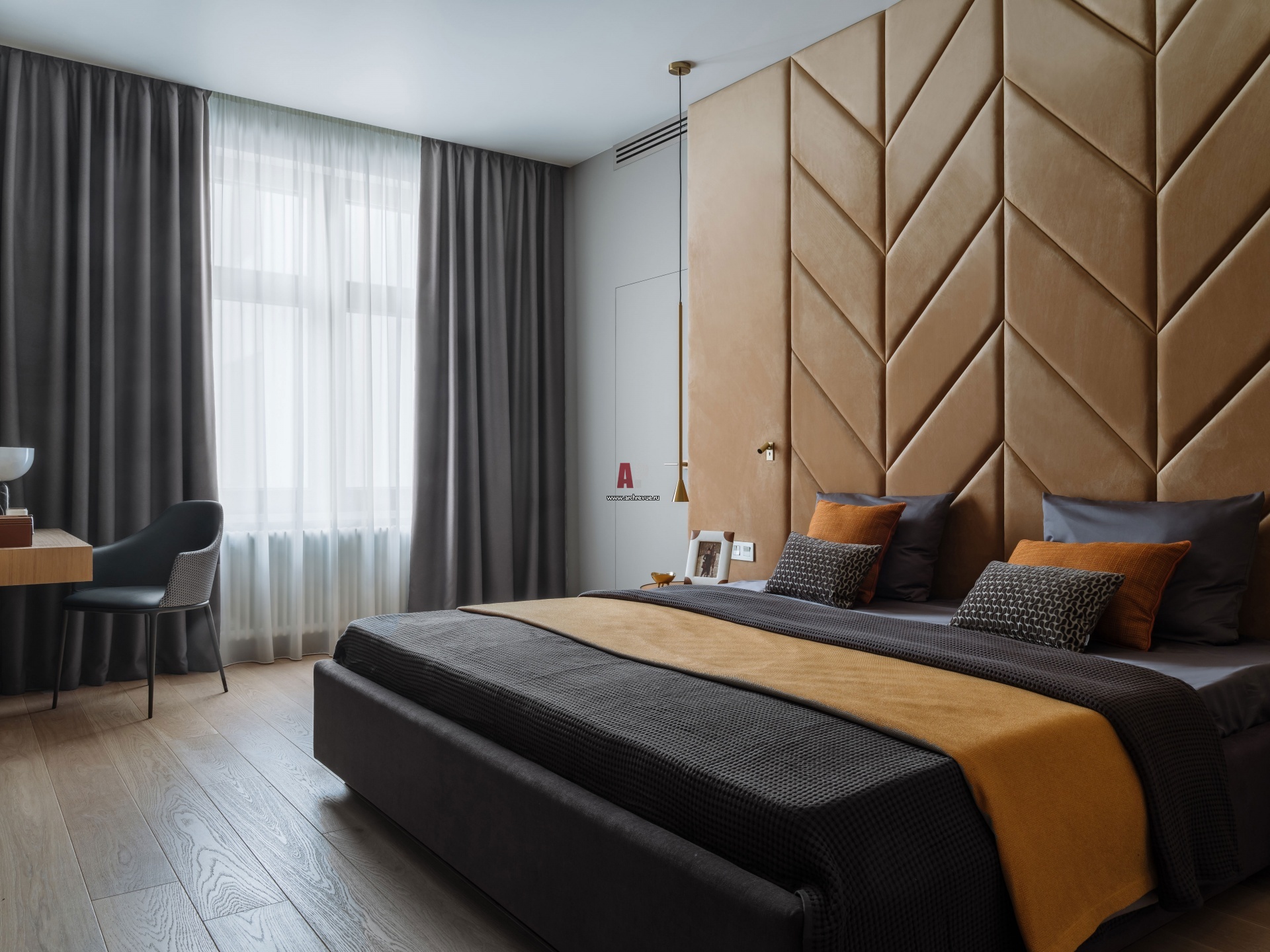 Хозяйская спальня. Кровать и стеновая панель выполнены на заказ. Тумбочка Poliform, модель Onda. Текстиль, Dantone Home.