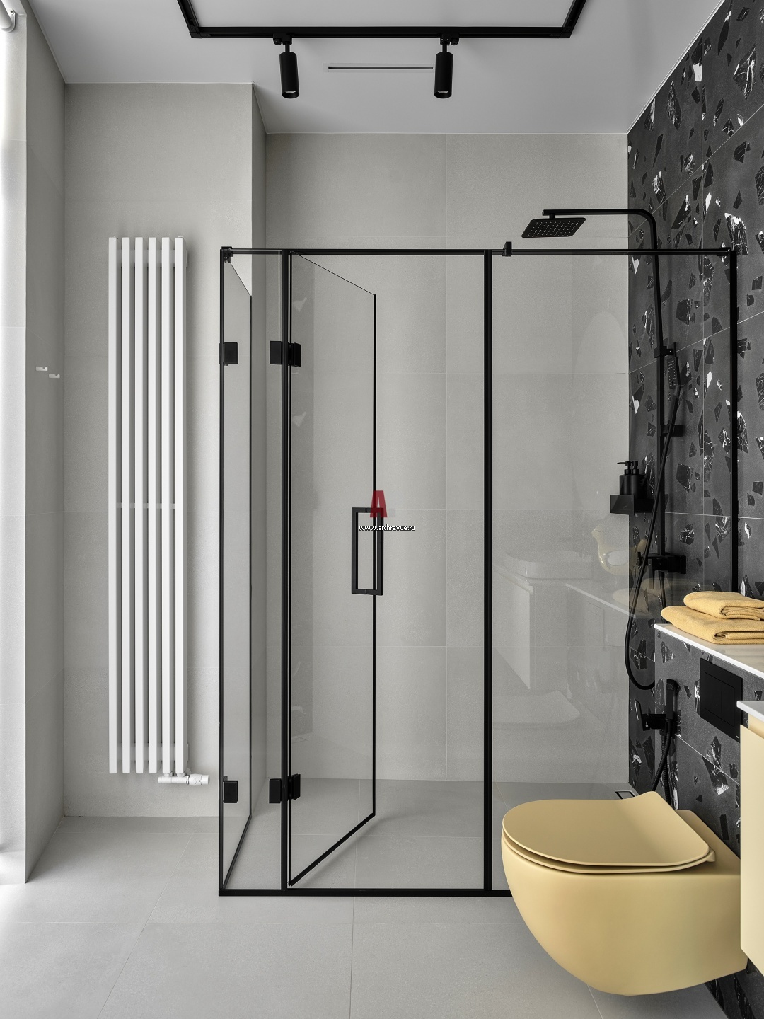 Трехэтажный дом в пригороде Новосибирска для семьи. Мужской санузел. Санфаянс выполнен в пастельно-желтом оттенке.