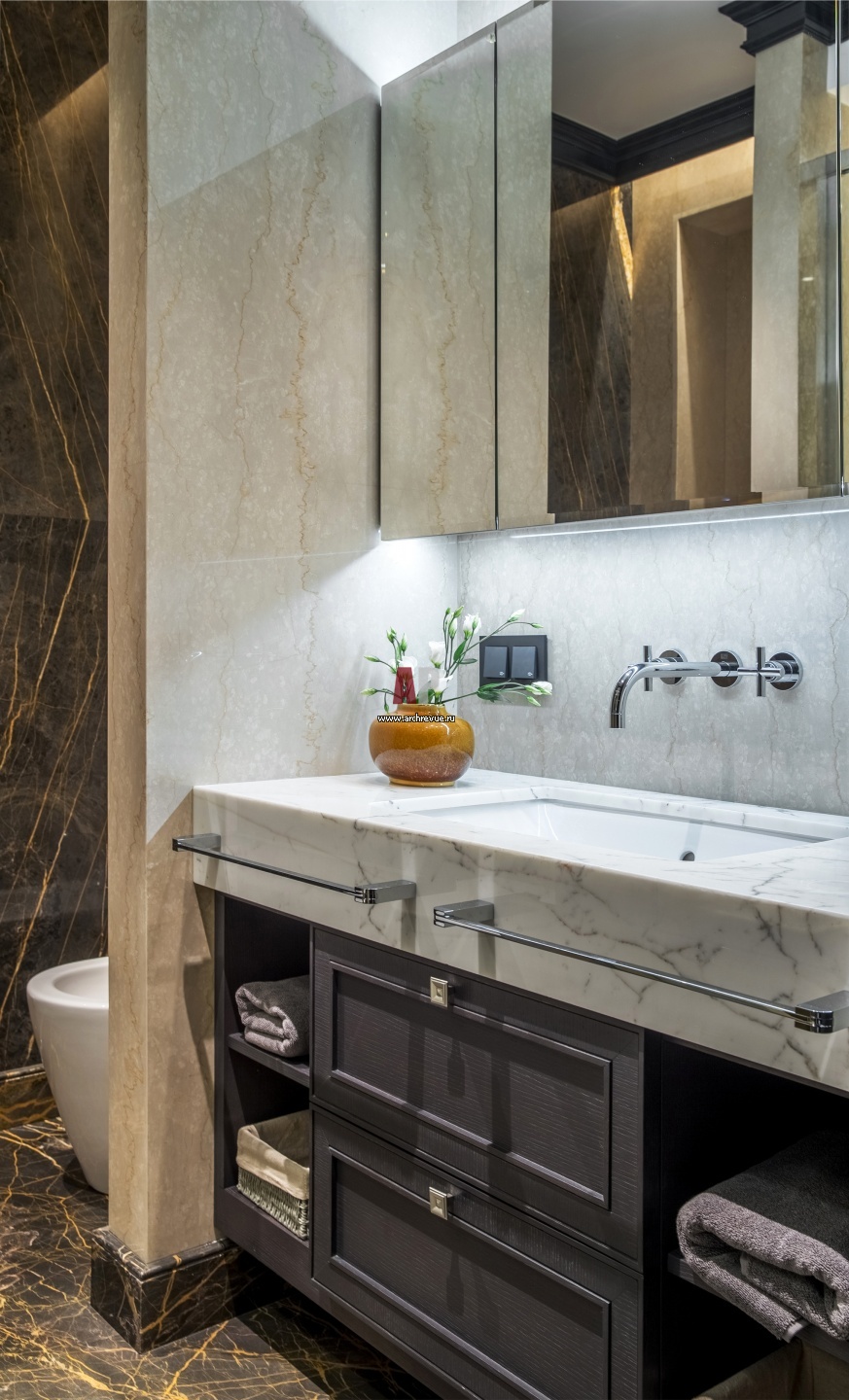 Квартира для временного проживания. Хозяйская ванная комната отделана натуральным камнем. Раковина, Villeroy & Boch.