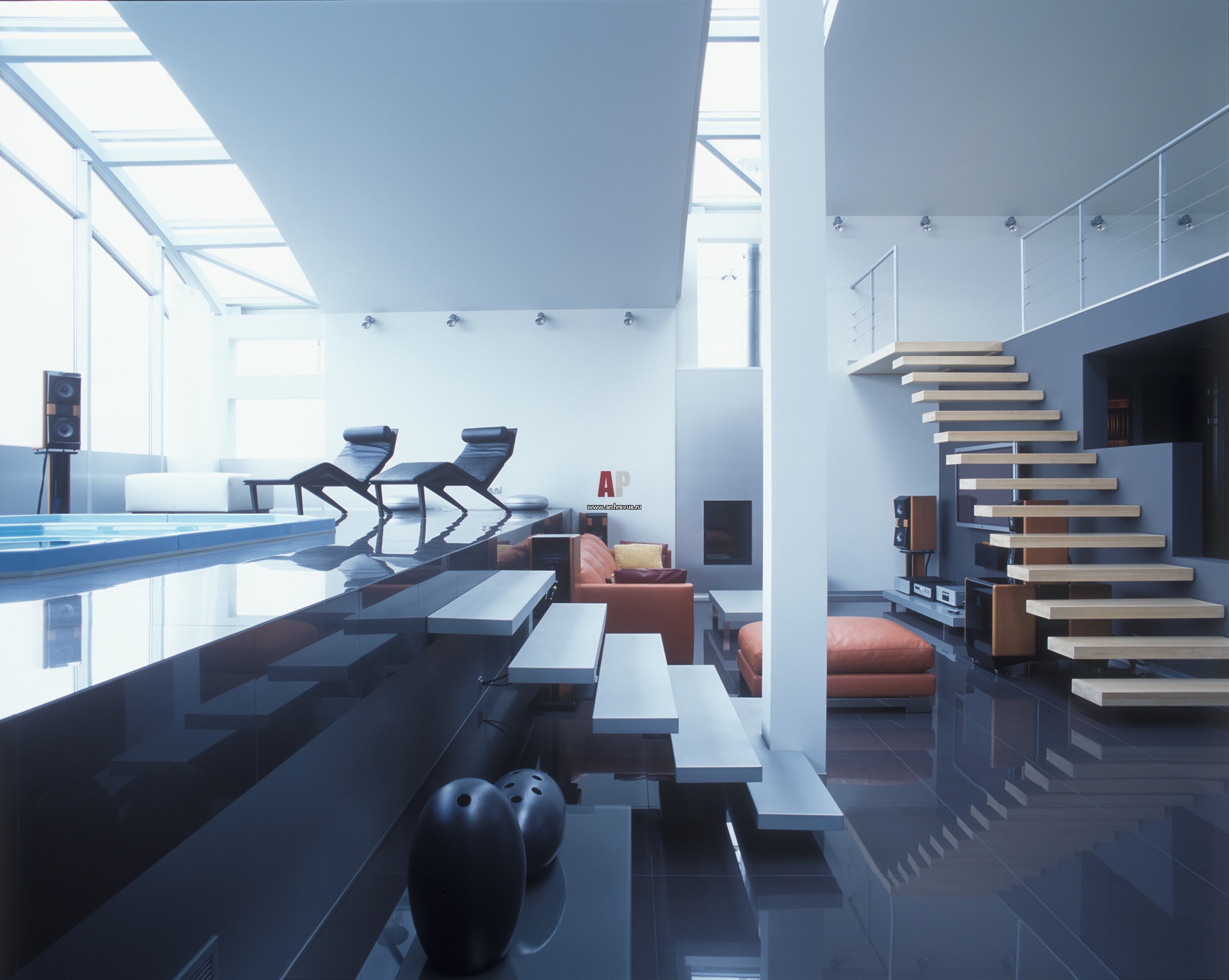 Перепад кровли вновь спроектированного объема позволил сделать в пентхаусе антресоль с зоной отдыха и небольшой подиум, в который вмонтирован мини-бассейн Hoesch, поставщик «Нэксклюзив», и спрятана вся система вентиляции и кондиционирования третьего этажа. Благодаря подиуму можно даже лежа в бассейне наслаждаться панорамой города, так как уровень воды находится вровень с окнами. Камин изготовлен по эскизам архитекторов, поставщик «Интерьерный салон» («Арт-тон камины»). Шезлонги, Molteni&C.