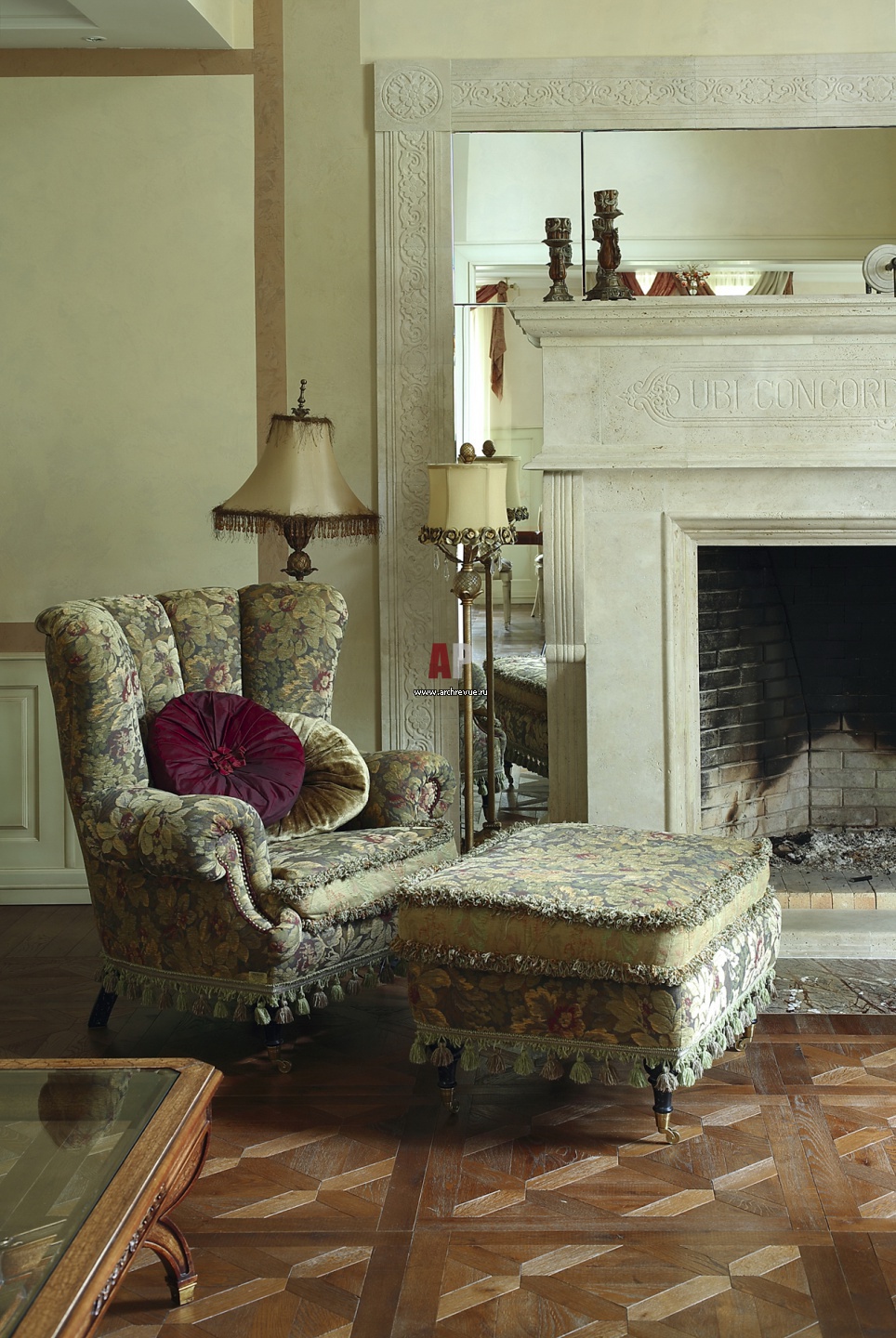Портал камина сделан из травертина, украшенного резьбой. Изготовление, компания «Мастер Лэнд». Орнаментальный паркет, поставщик Parquet in.