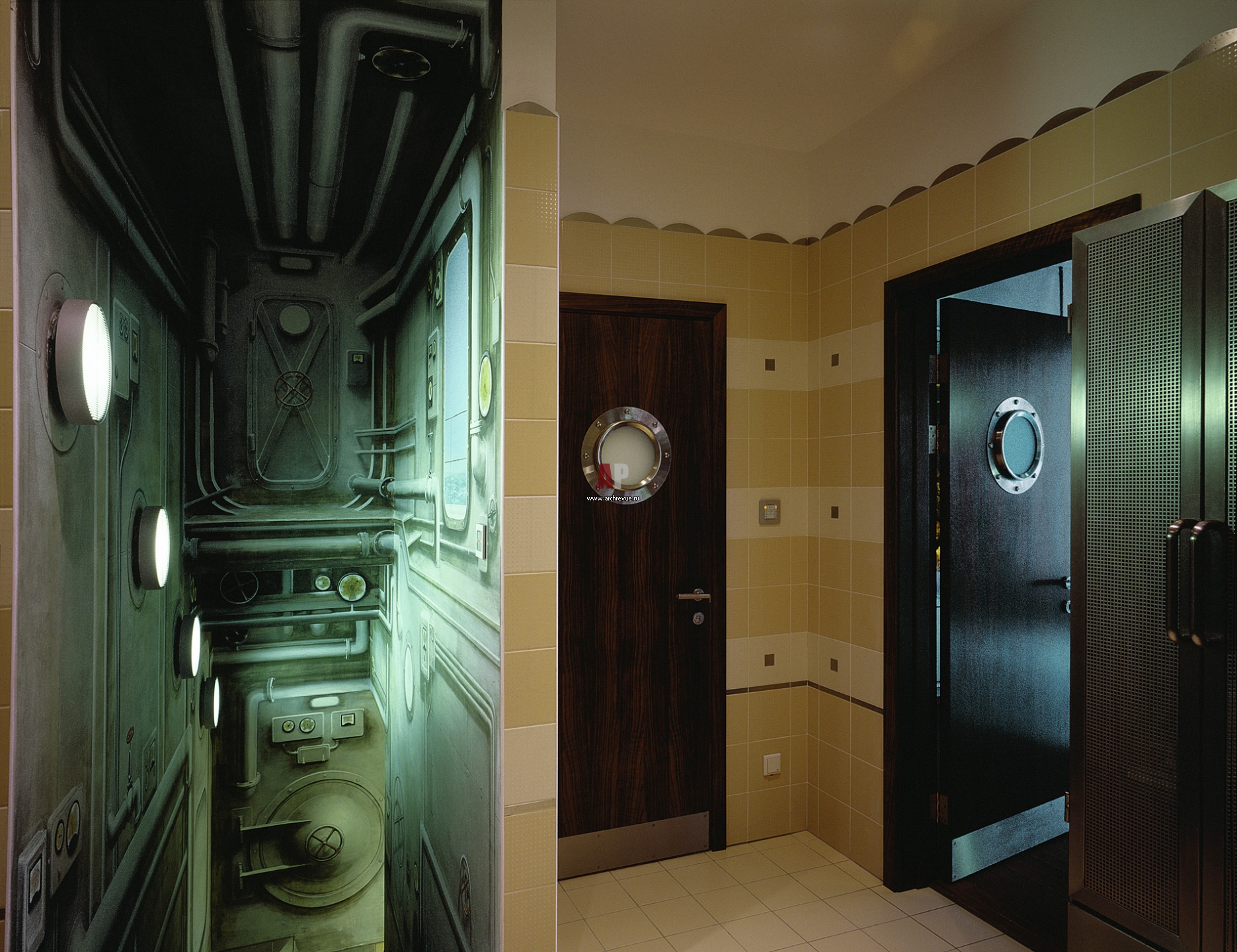Для оформления лестницы, ведущей в зону фитнеса, использована идея росписи-обманки на тему камбуза старой подводной лодки.