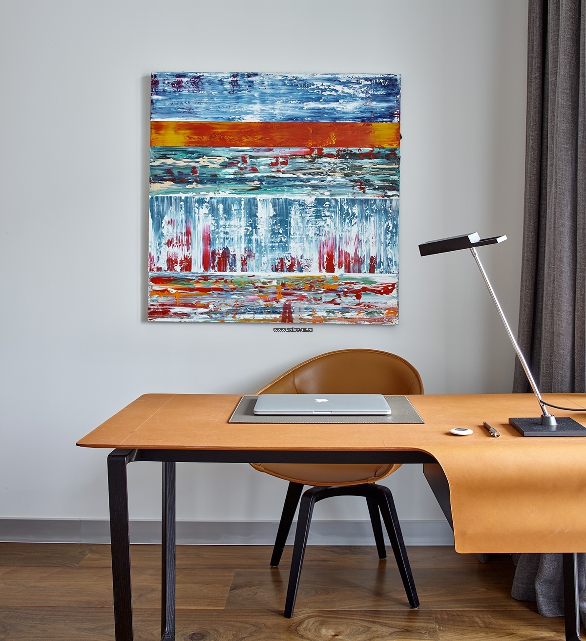 Фото интерьера кабинета панорамной квартиры в стиле минимализм.