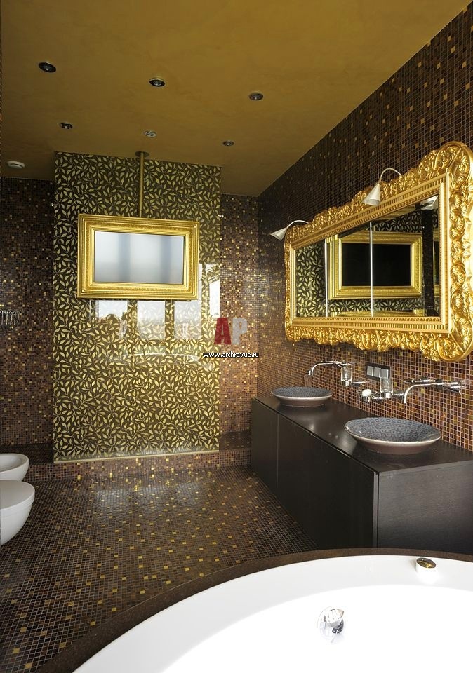 Интерьер хозяйской ванной комнаты в золотисто-шоколадных тонах. Душевая перегородка украшена золотистым растительным орнаментом, он повторяет рисунок расписного потолка в спальне. Умывальник, Antonio Lupi. Раковины, Kohler.
