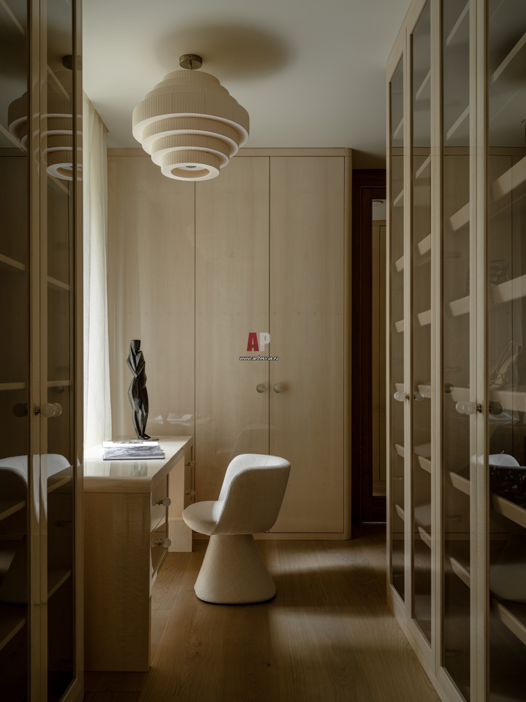Все наполнение гардеробной, включая шкафы со скругленными фасадами, выполнено из сикомора с нежной сливочной палитрой и глянцево-перламутровым финишем. Люстра, Bover.