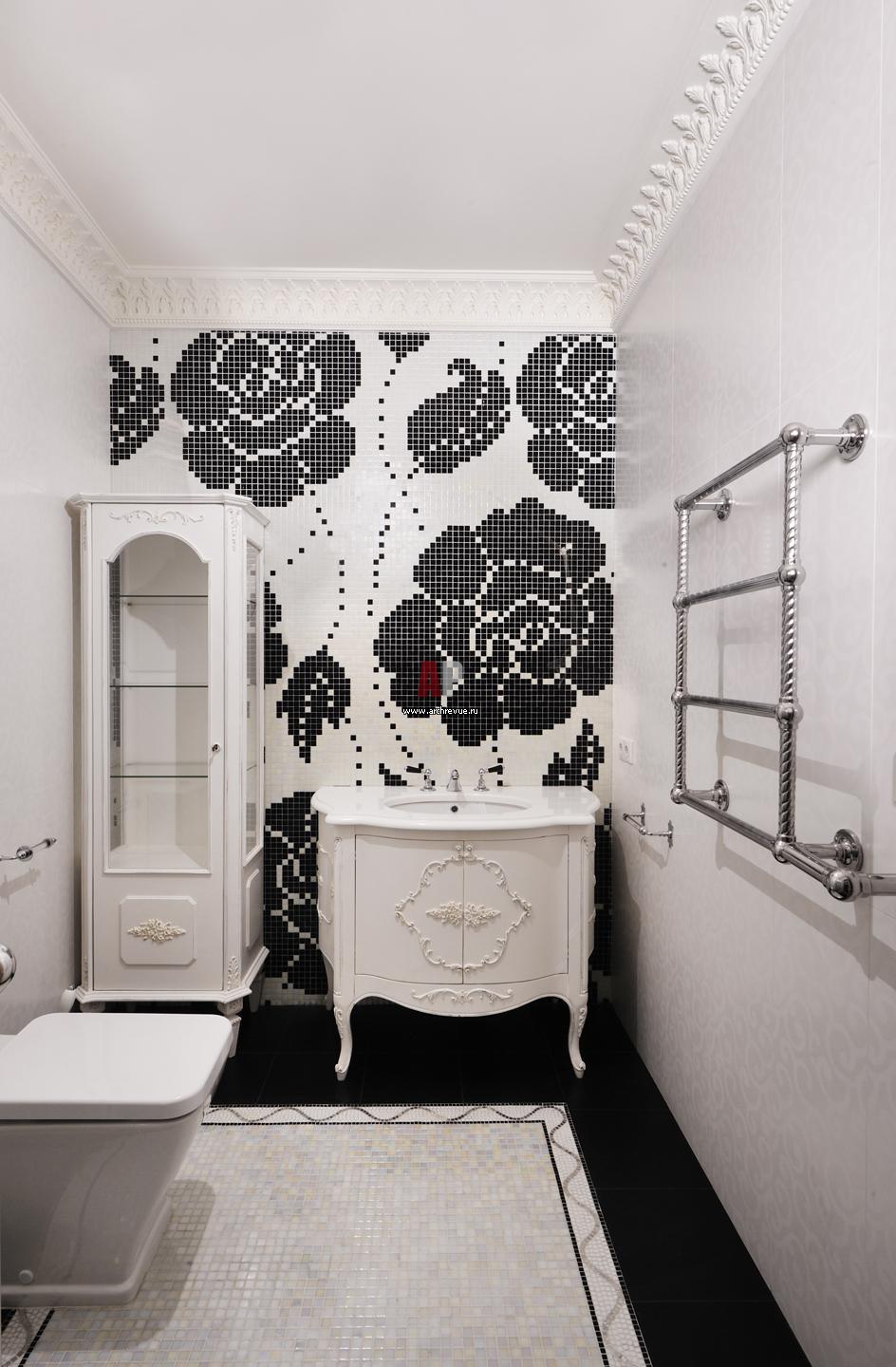 Интерьер санузла решен в черно-белой гамме, он декорирован мозаичным панно, поставщик «Л-Камень» и лепниной. При этом сантехника современного дизайна, поставщик «Интерьеры Экстра Класса», смотрится в нем органично.