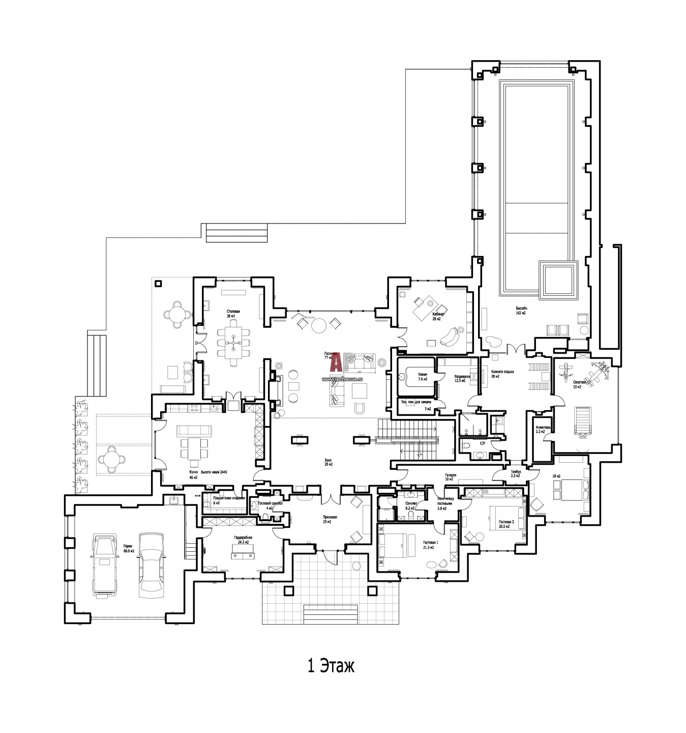 План первого этажа трехэтажного дома в Подмосковье. Общая площадь – 1400 кв. м.
