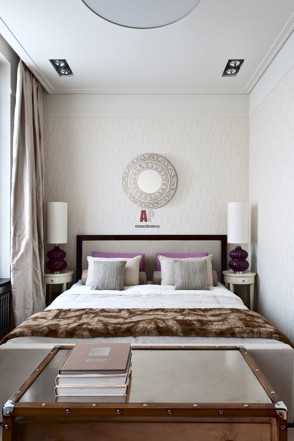 Белая гостевая спальня в стиле фьюжн. Лаконичный лепной карниз визуально увеличивает высоту помещения. Обои, лепной декор, поставщик «Ампир Декор».